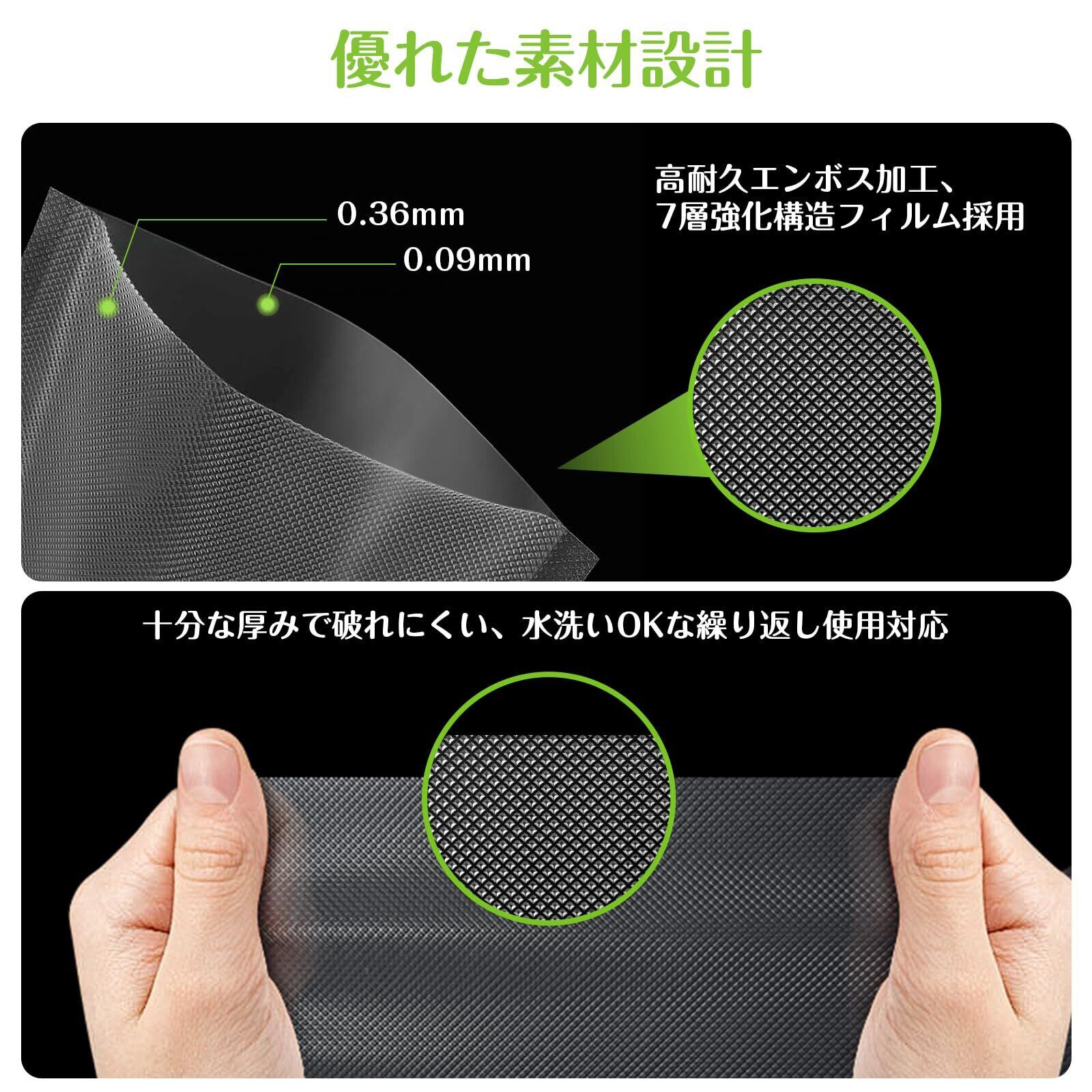 【高性能エンボス加工】片面(0.09mm厚さ)は滑らかで透明、もう片面(0.36mm厚さ)にはエンボス加工が施されています。これにより空気が抜けやすく、様々なプロ真空パック機は高い吸引力を発揮します。(※プロの真空パック機を使用してください。いくつかの特定の真空パック機は適していません。)