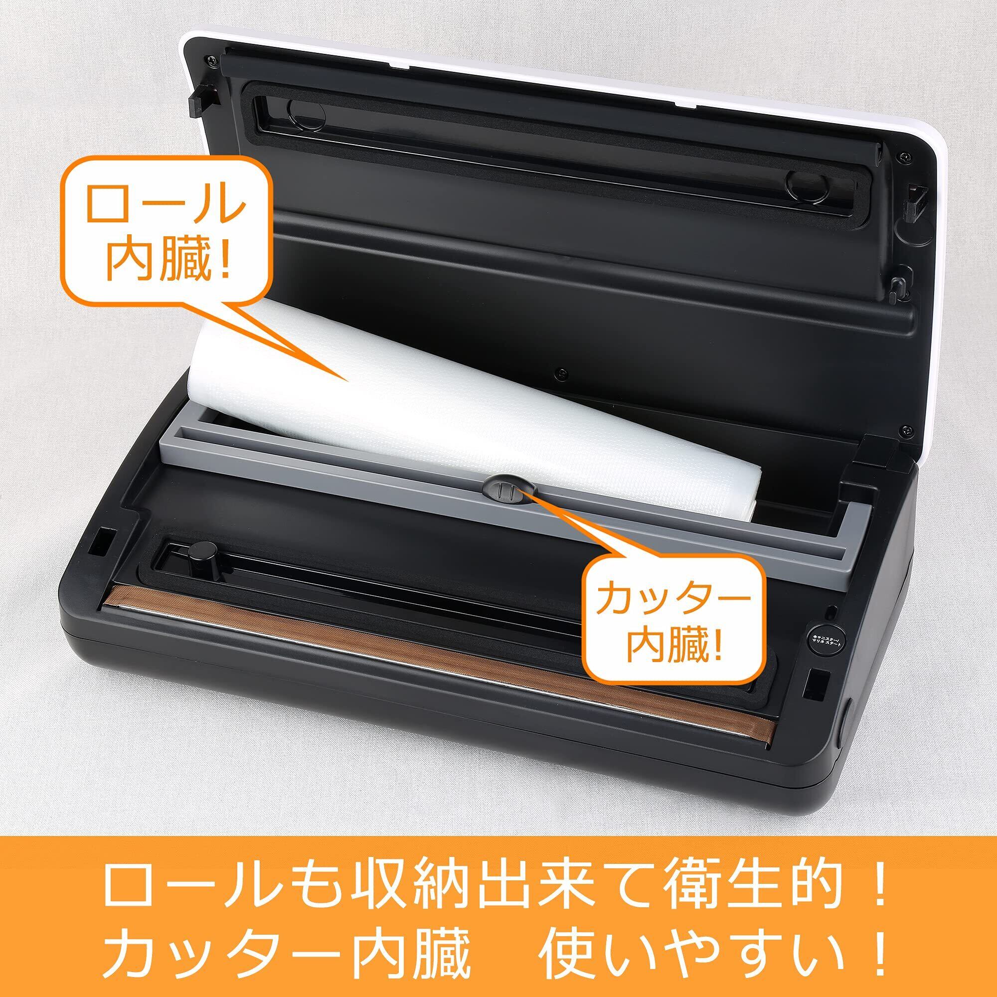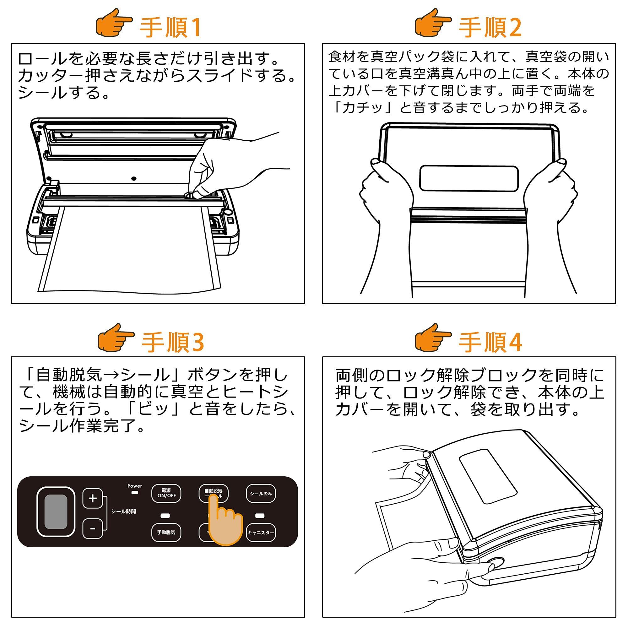 【商品仕様】【内容】真空パック機本体×1台、日本語取扱説明書×1冊、接続用ホース×1本、真空パックロール大約28cm(11”)×1本、約20cm(8”)×1本。【真空機サイズ】380x200x102mm。【シール可能幅】最大31cm×2mm×2本。【電源】100V~ 50/60HZ。【消費電力】210W。【脱気圧】-28.3"Hg(-958 mbar)。【ポンプ】2個。【期間】。【重量】約2.6kg。