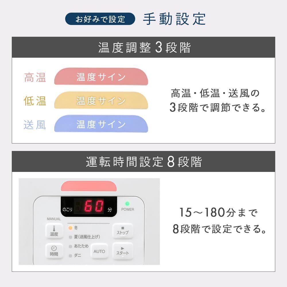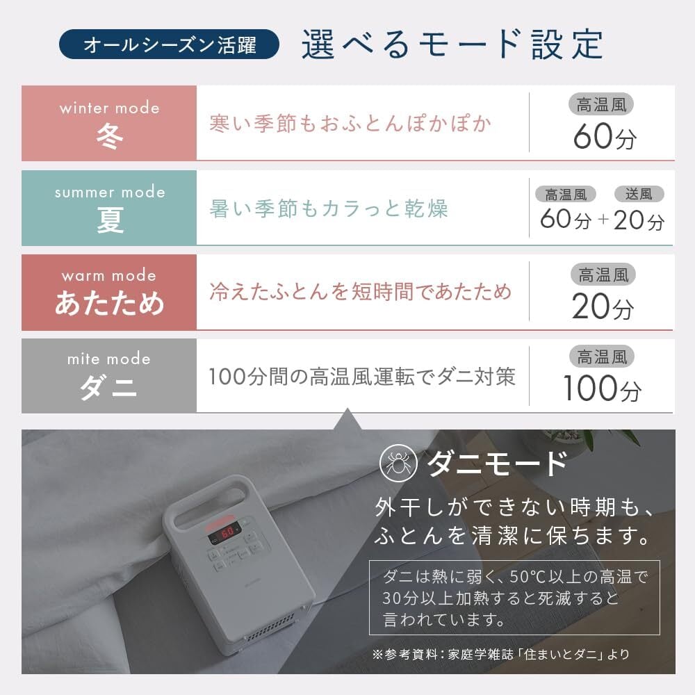 【選べるモード】あたためモード:就寝前におすすめ!ふとんを短時間であたためる。/冬モード:寒い季節でもぽかぽか!冷えたふとんをあたため、乾燥。/夏モード:暑い季節でもカラッと乾燥!さわやかな風で熱気を逃がす。/ダニモード:外干しができない時期もふとんを清潔に保つ。[ダニは熱に弱く、50℃以上の高温で30分以上加熱すると死滅すると言われています。※参考資料:家庭学雑誌「住まいとダニ」より。]