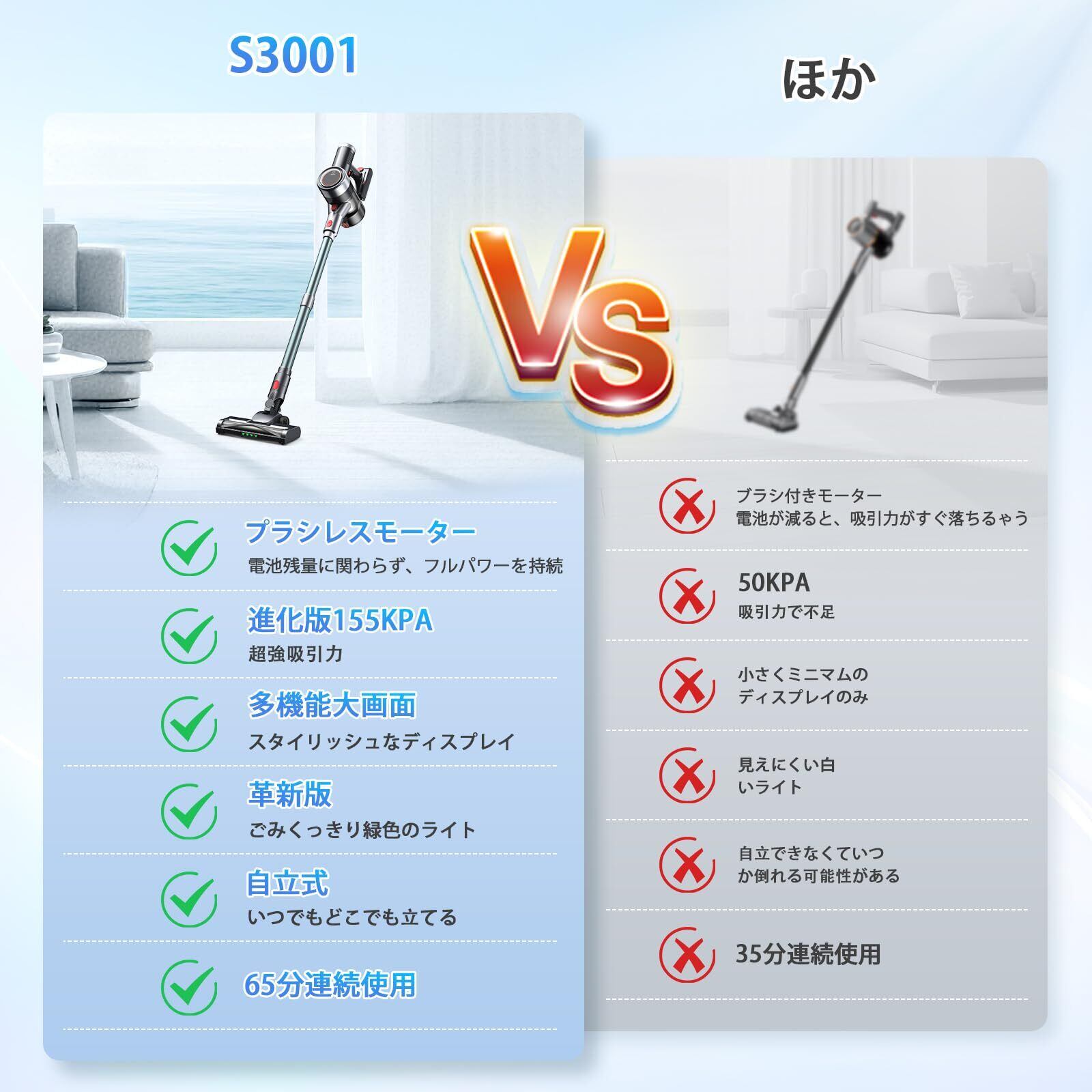 【155KPa超強吸引力&AIゴミ感知センサー×3段階吸引力&史上最軽量】2026革新モデル3001掃除機はは市販最先端の550Wブラシレスモーターを採用し、吸引力が155KPa以上に達し、従来の掃除機より66%アップ!遠心分離サイクロン方式を採用されて、ゴミと空気をしっかりと分離し、強力な吸引力が持続します。床面の微細なゴミからペットの毛、大きなホコリまで吸引可能です。また、独自開発のAI自動制御システムで、スマートな吸引力コントロールが、省エネでありながら、ハイパワーと低騒音を見事に両立させました。掃除機はワンタッチでエコ・標準・強力3段階吸引モードを簡単に切り替えられ、ゴミの大小と種類によって、自由に選択でき。尚、軽量設計なので、自走式ローラブラシと組み合わせ、女性でも片手で力を入れずにぐんぐん進み、毎日のお掃除が楽々に!
