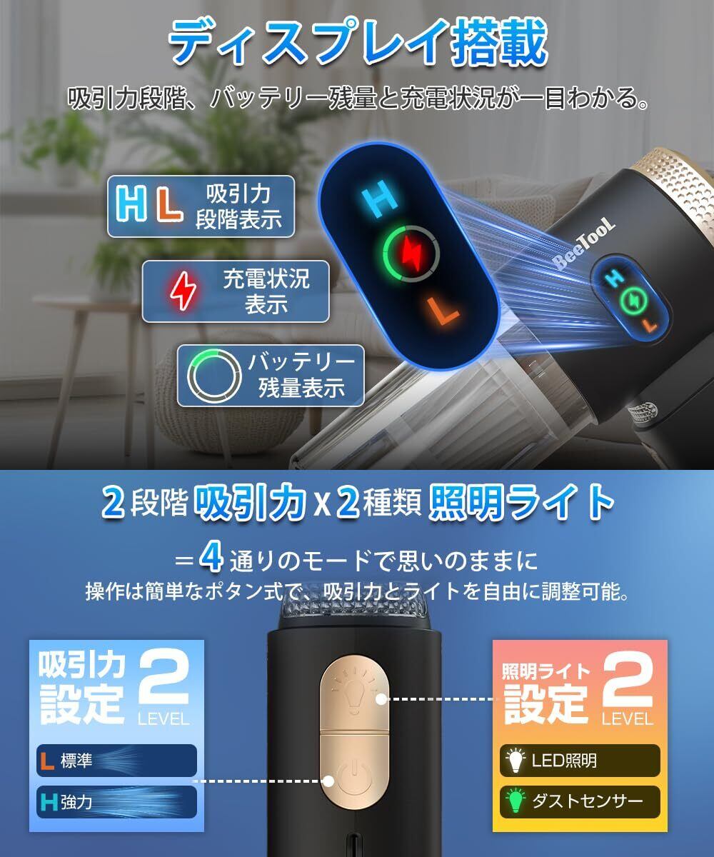 【LEDディスプレイ搭載!吸引力2段階調整可能!】このハンディ掃除機は、ライトモードと吸引力モードを独立ボタンで調節可能。自由に組み合わせて、シーンに合わせた清掃が実現! 先進LEDディスプレイ搭載:吸引力モード、残バッテリー量、充電状態が一目で確認可能。効率的な清掃をサポートします。 ワンタッチで標準/強力の2段階吸引力を切替可能:操作性に優れ、快適な使用感を提供します。超強力モーターを採用し、吸引力は40KPaを実現。従来の小型掃除機と比較して150%向上したパワーで、一度で徹底吸引、効率的な清掃を叶えます。
