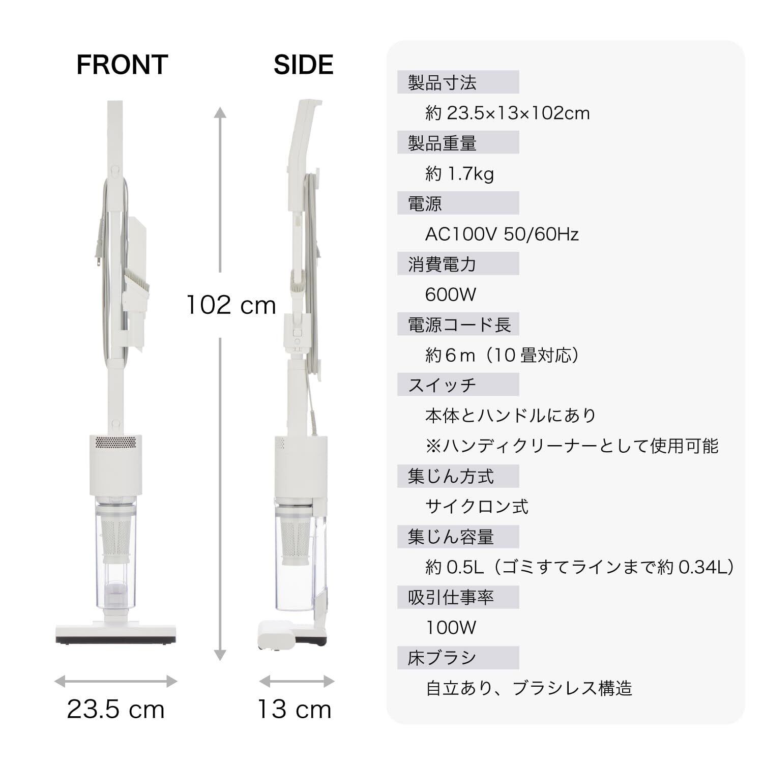 【製品サイズ】約23.5×13×102cm【製品質量】約1.7kg【集じん方式】サイクロン式【付属品】すき間ノズル(毛ブラシ付き)、すき間ノズルホルダー