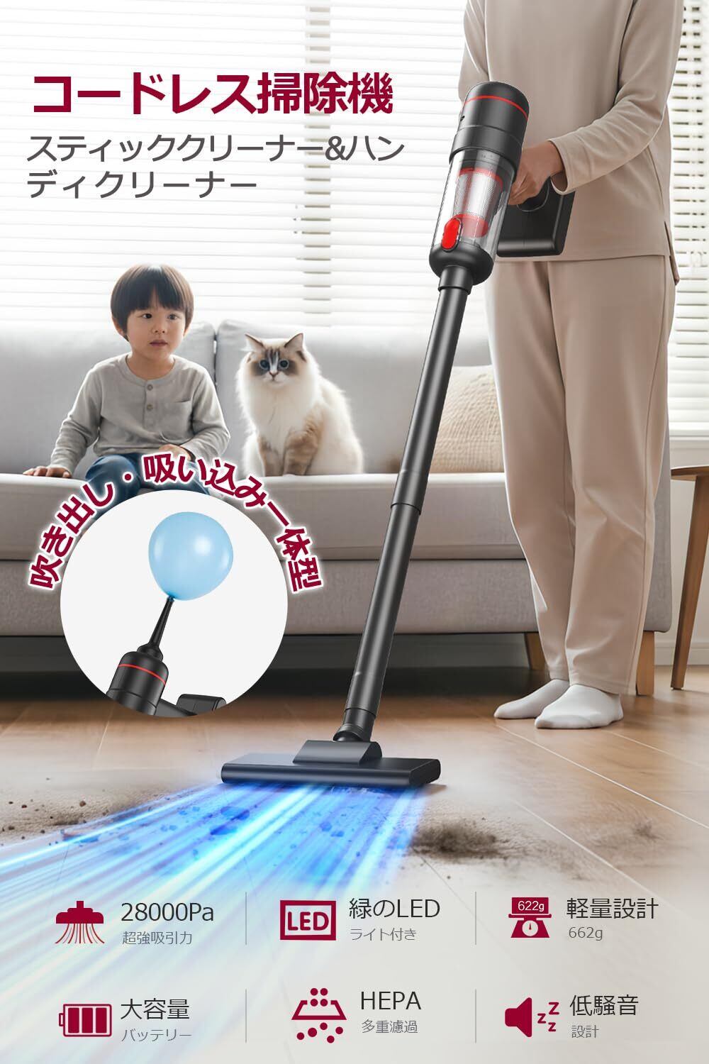 【2026業界進化版・28000Pa超強力吸引+吹き出し機能で1台2役】2026業界進化版として誕生した本モデルは、最大28000Paの超強力吸引を実現した掃除機 コードレスです。フローリングのパンくずや髪の毛、ペットの毛はもちろん、カーペットや畳の奥に入り込んだ微細なホコリまで一気に吸引。さらに本製品は電動エアダスター機能を搭載し、吸うだけでなく強力な吹き出しも可能。キーボードの隙間、窓サッシ、エアコン送風口、車内の細部など、通常のコードレス掃除機では届きにくい箇所も徹底清掃できます。スティッククリーナーとして広範囲を効率よく掃除し、ハンディクリーナーやハンディ掃除機として狭い場所にも対応。1台で「吸引+送風」をこなす次世代型スティック掃除機です。