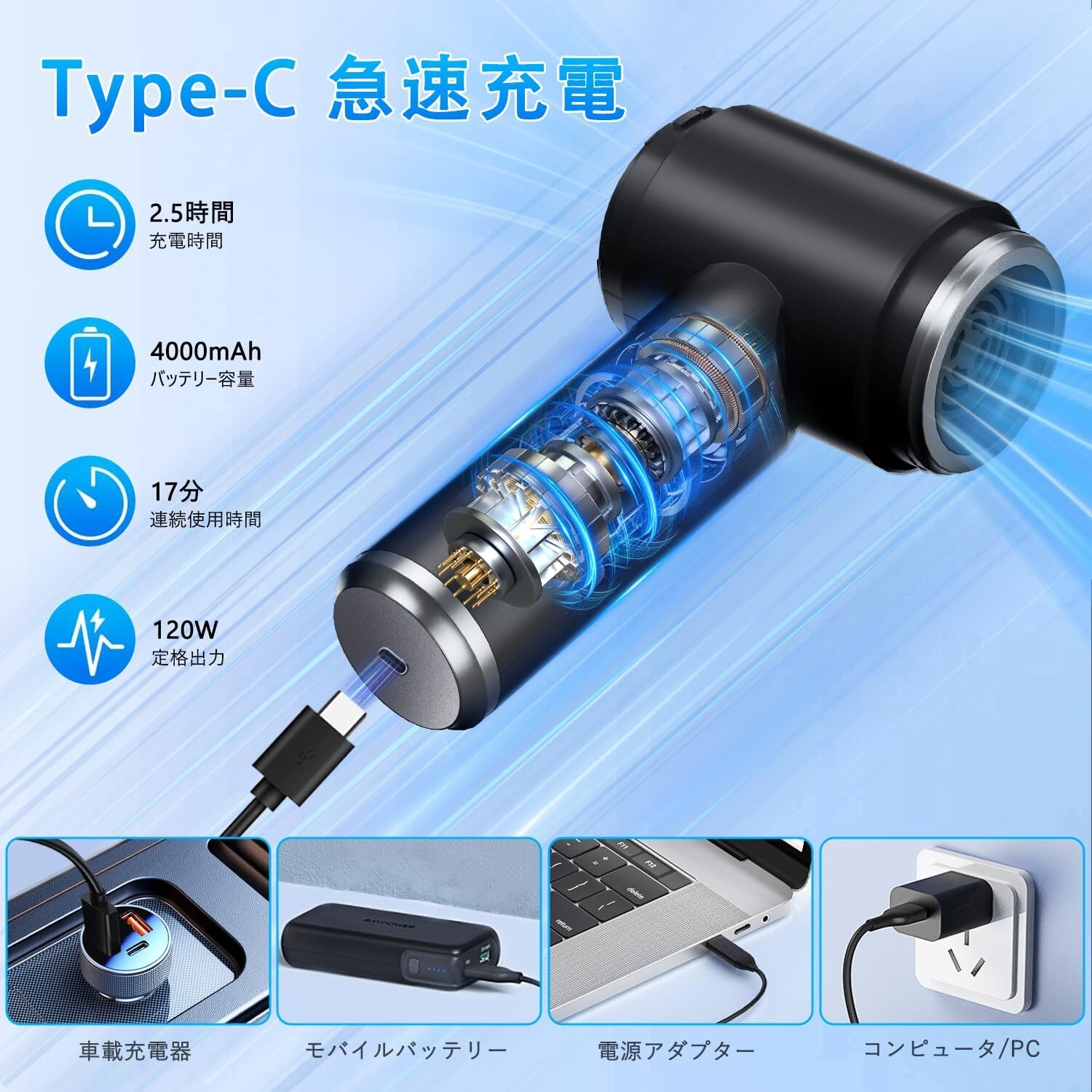 【Type-C充電&長時間使用】※商品に付属の充電器を使用して充電してください!このポータブルコードレス車用掃除機は、Type-C充電ポートを使用し、内蔵の4000mAh充電式バッテリーを搭載しています。急速充電は3.5時間で完了し、17分間の連続使用が可能です。さらに、45dB以下の静音設計により、どこでも簡単にクリーナーを充電でき、ストレスなく快適に清掃を行えます。
