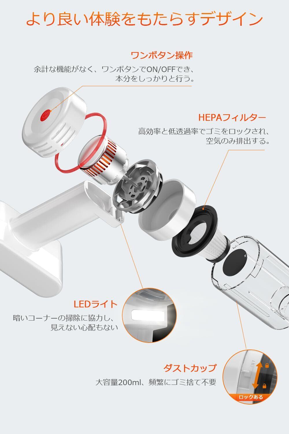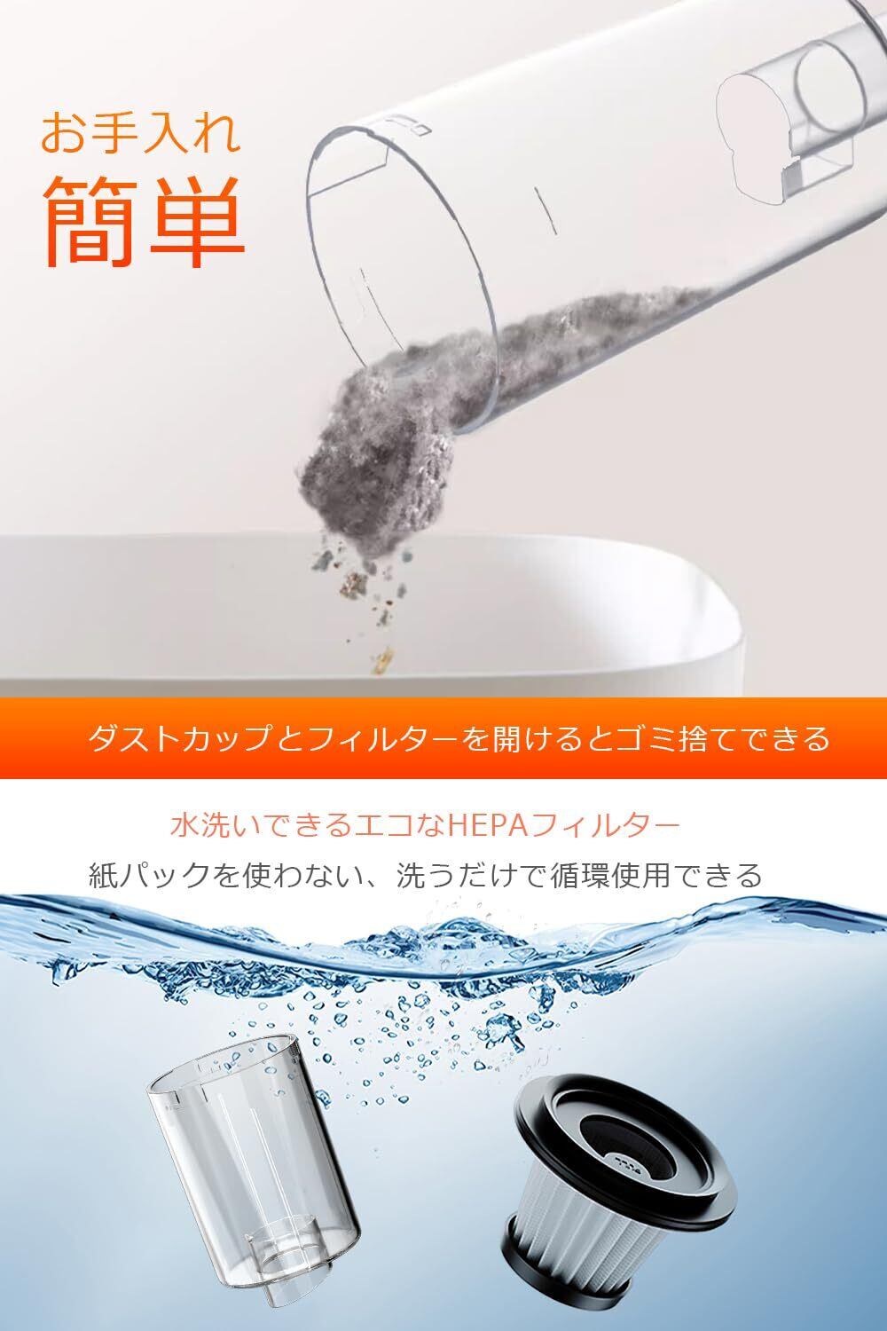 【大容量ダストカップと視認性の高さ】この掃除機には200mlの大容量透明ダストカップが搭載されており、ゴミの量を一目で確認できます。頻繁にゴミを捨てる手間が省けるため、効率的に掃除が行えます。ダストカップは取り外しが簡単で、水洗いも可能なので、常に清潔に保つことができます。また、ゴミがたまったらすぐに捨てられるので、手軽に扱えます。視認性の高いデザインは、掃除中にゴミの状態を確認するのに便利です。掃除が終わった後も手間がかからず、快適に使用し続けられるのが魅力です。