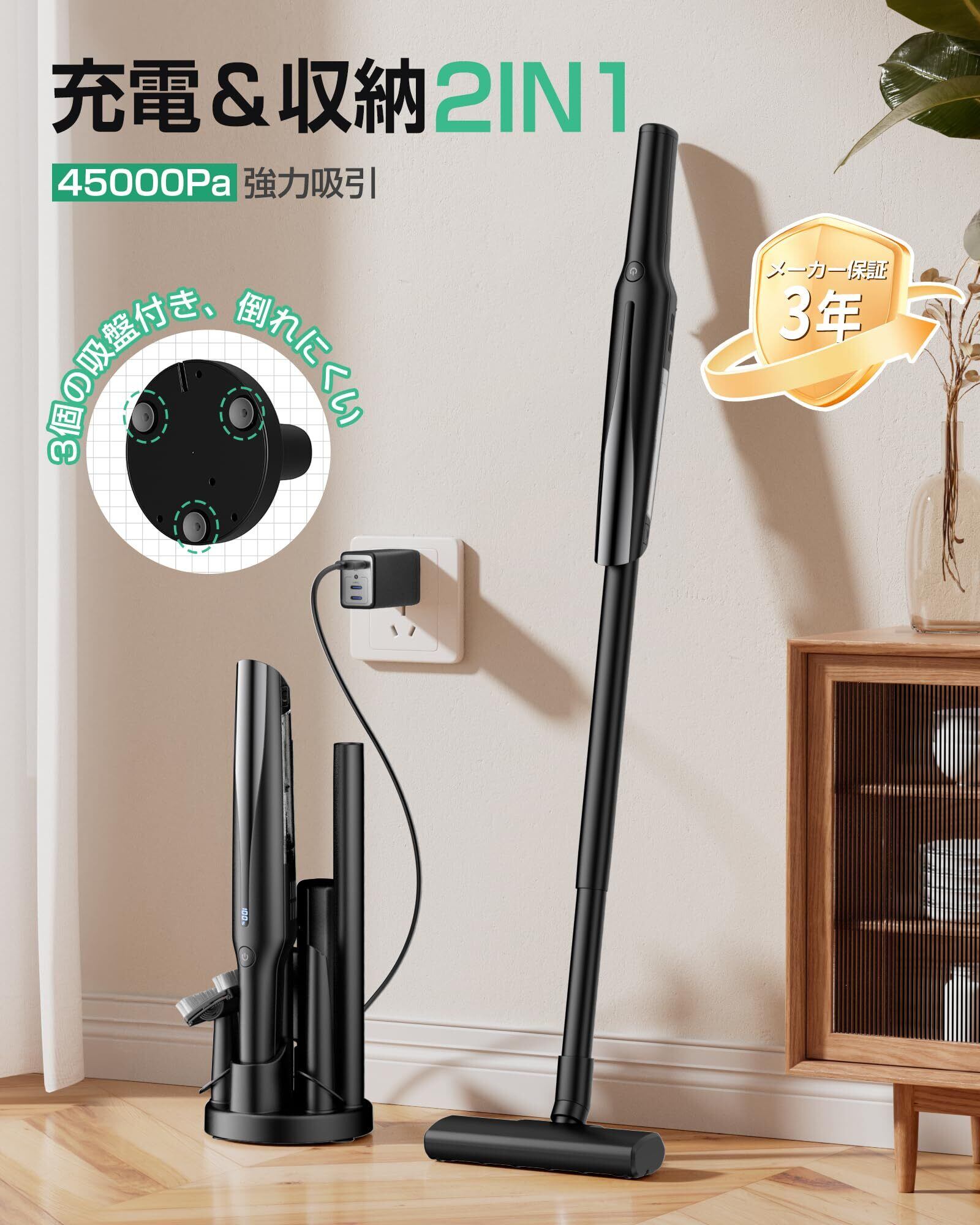 【45KPa 超強力吸引 × 0.5kg超軽量】このコードレス掃除機は床面の微細なゴミからペットの毛、大きなホコリまで吸引可能です。また、独自の低騒音化技術により、運転音と運転時に不快に感じる耳障りな音(ピーク音)を抑制できて、周囲や時間を気にせず掃除可能です。強吸引力と低騒音を両立させます!更に、わずか 0.5kg の超軽量ボディで、女性・高齢者でも腕の負担なく快適に操作できます。大きなスタンドを置いて余計なスペースを取ったり、壁に穴を開けたりする必要もありません。掃除も収納も楽々。