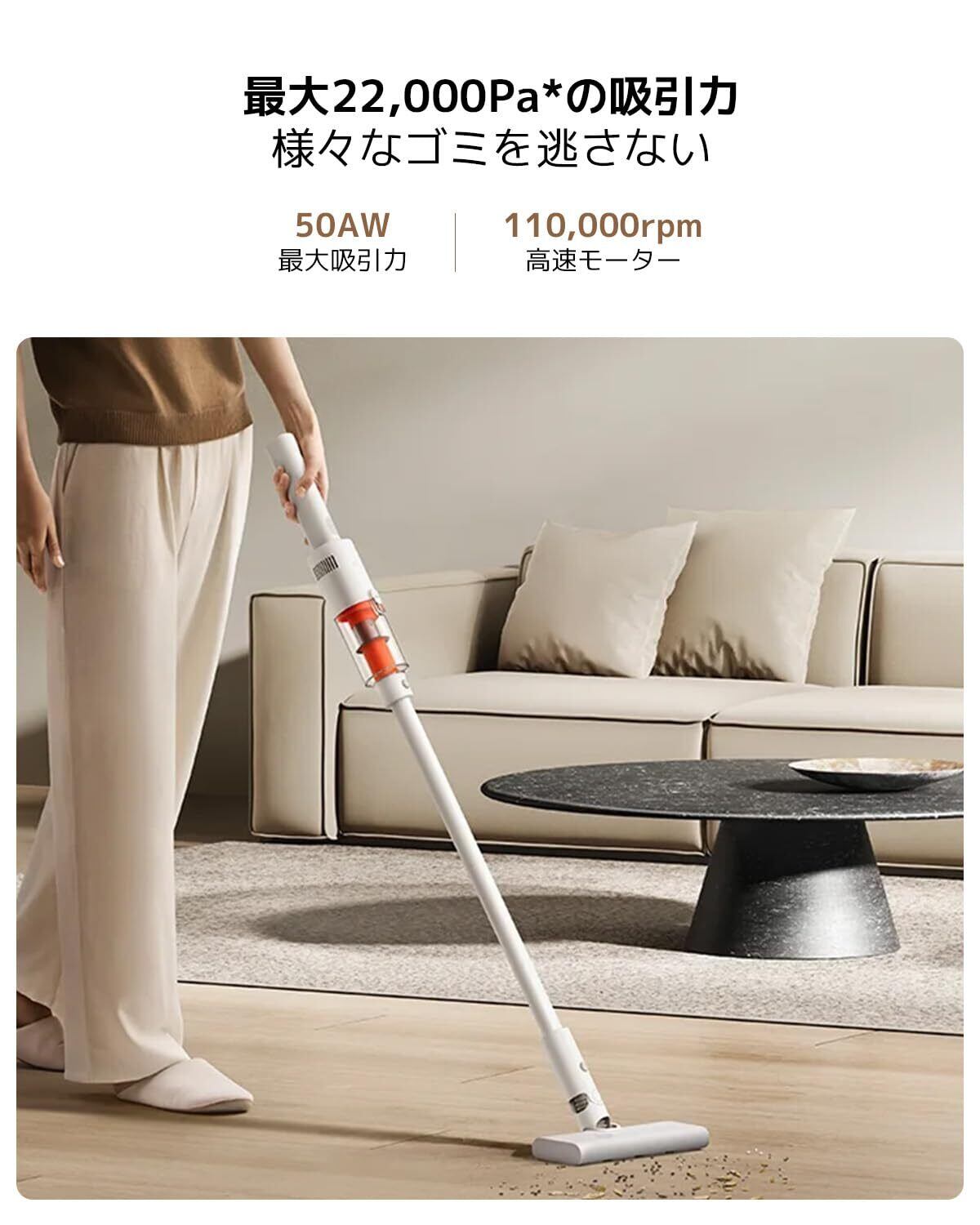 【強力吸引・軽量設計】22,000Paの吸引力と860gの軽量ボディを両立。高速モーターで微細なホコリまで確実に吸引し、カーテンや天井などの高い場所も簡単に掃除できます。