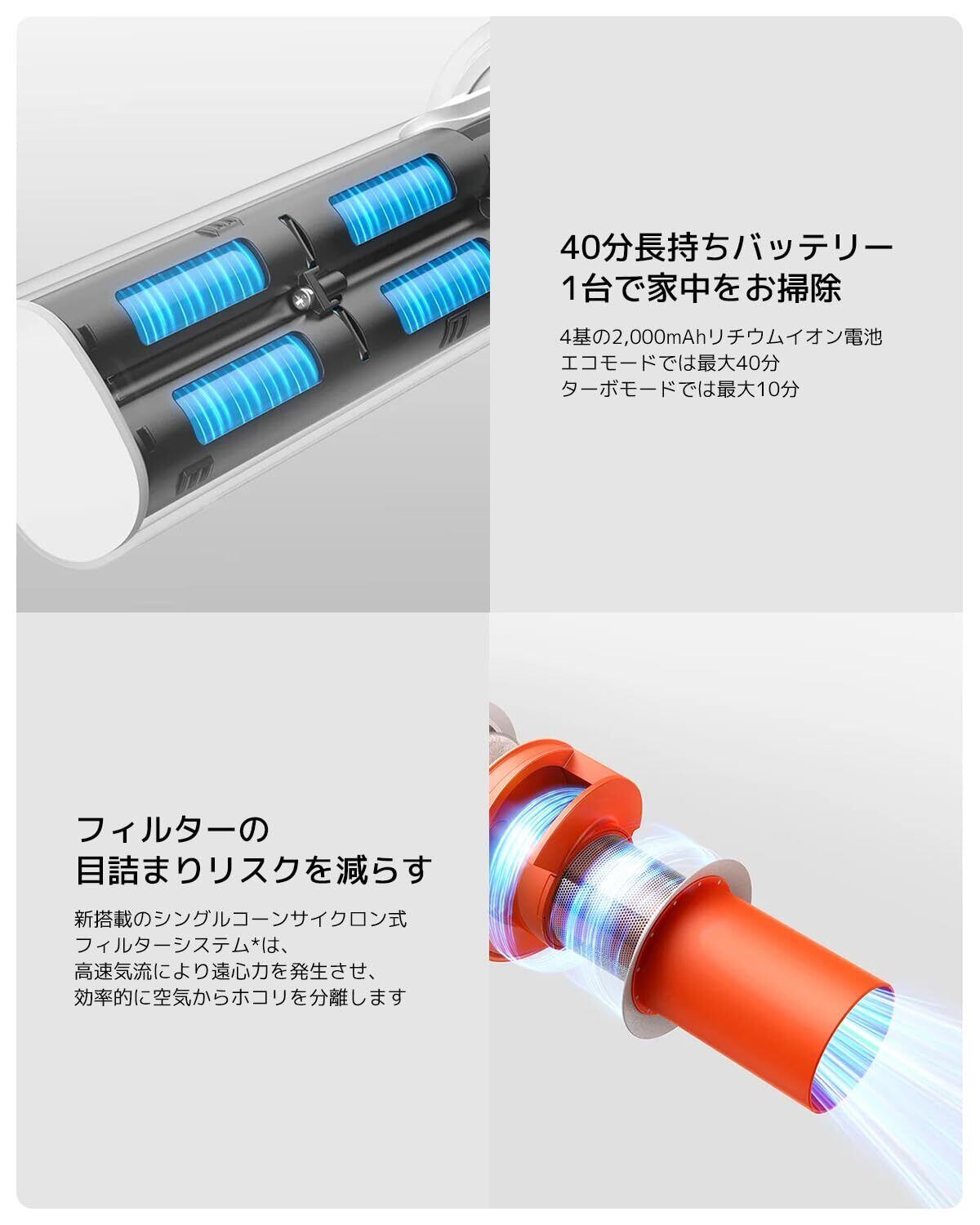 【長時間駆動 & 2モード切替え】4基の高容量リチウムイオン電池により、エコモード時は最大40分、ターボモード時は10分間の強力吸引を実現。充電1回で広い居住空間全体の清掃を完了させることが可能です。