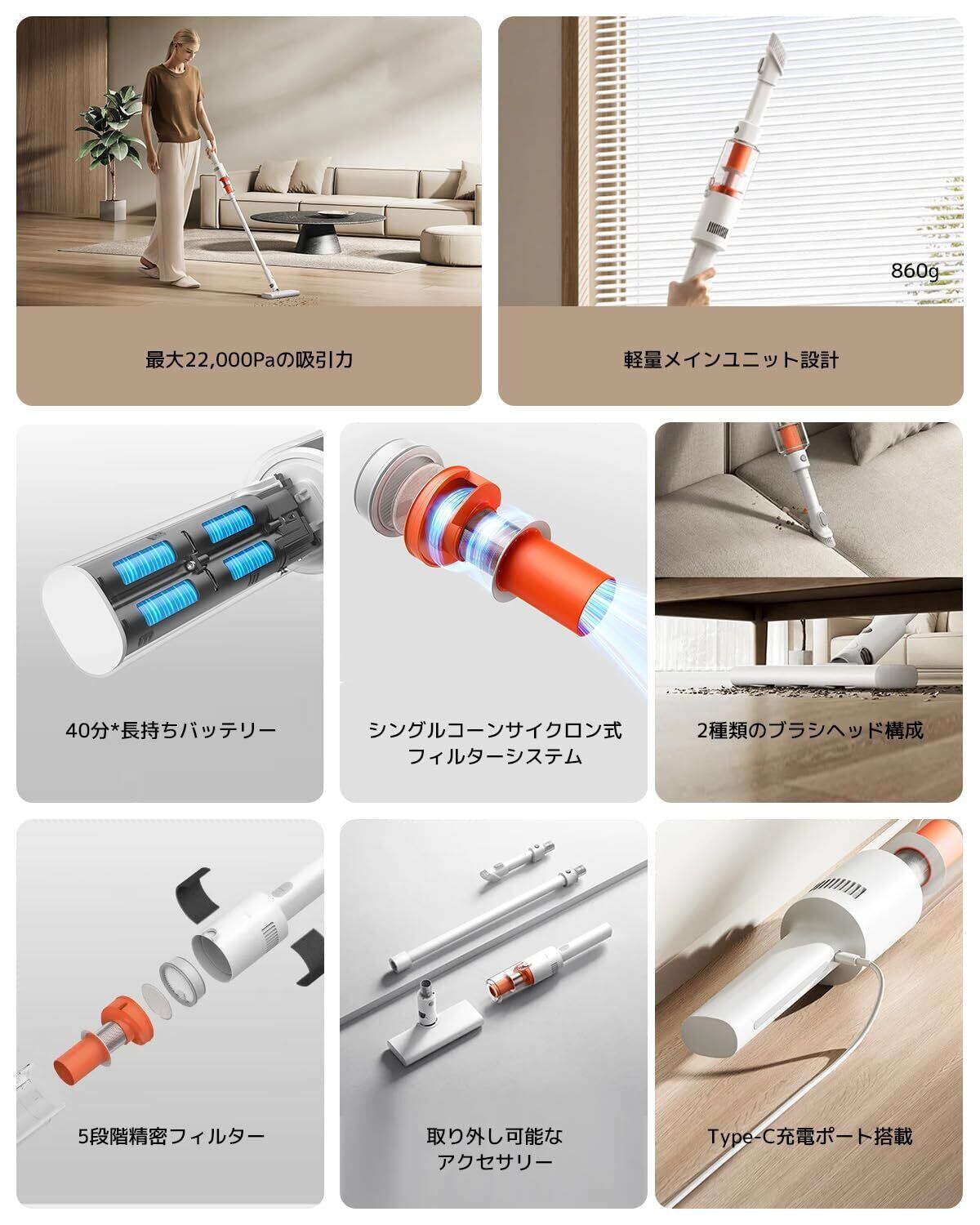 Xiaomi コードレス掃除機 P30 22,000Pa強力吸引 軽量860g 40分連続稼働 5段階精密フィルター 2WAYブラシノズル付き 車内&隙間掃除対応 USB Type-C充電 大容量バッテリー 最大24ヶ月