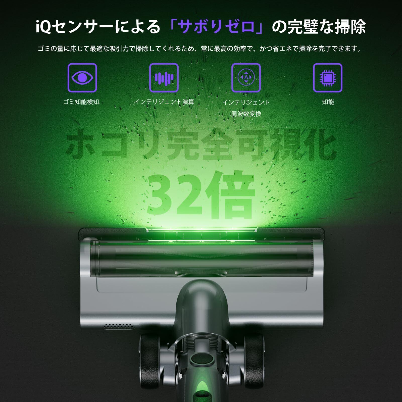 【革新版!「ごみくっきりライト」を搭載し見えないホコリを可視化!】掃除機は新たに全面発光緑色のLEDライトが備わっており、見えないホコリを可視化!従来の掃除機より可視率32倍アップ!市販の緑色ライトは片側に発光しかなくて照射範囲が狭い。掃除機 コードレスは全面発光で、光の分布がより均一で、暗いところはもちろん明るいところでも、見えにくかったゴミを浮かび上がらせて、微細なホコリや毛も可視化されて掃除効率を高めます。