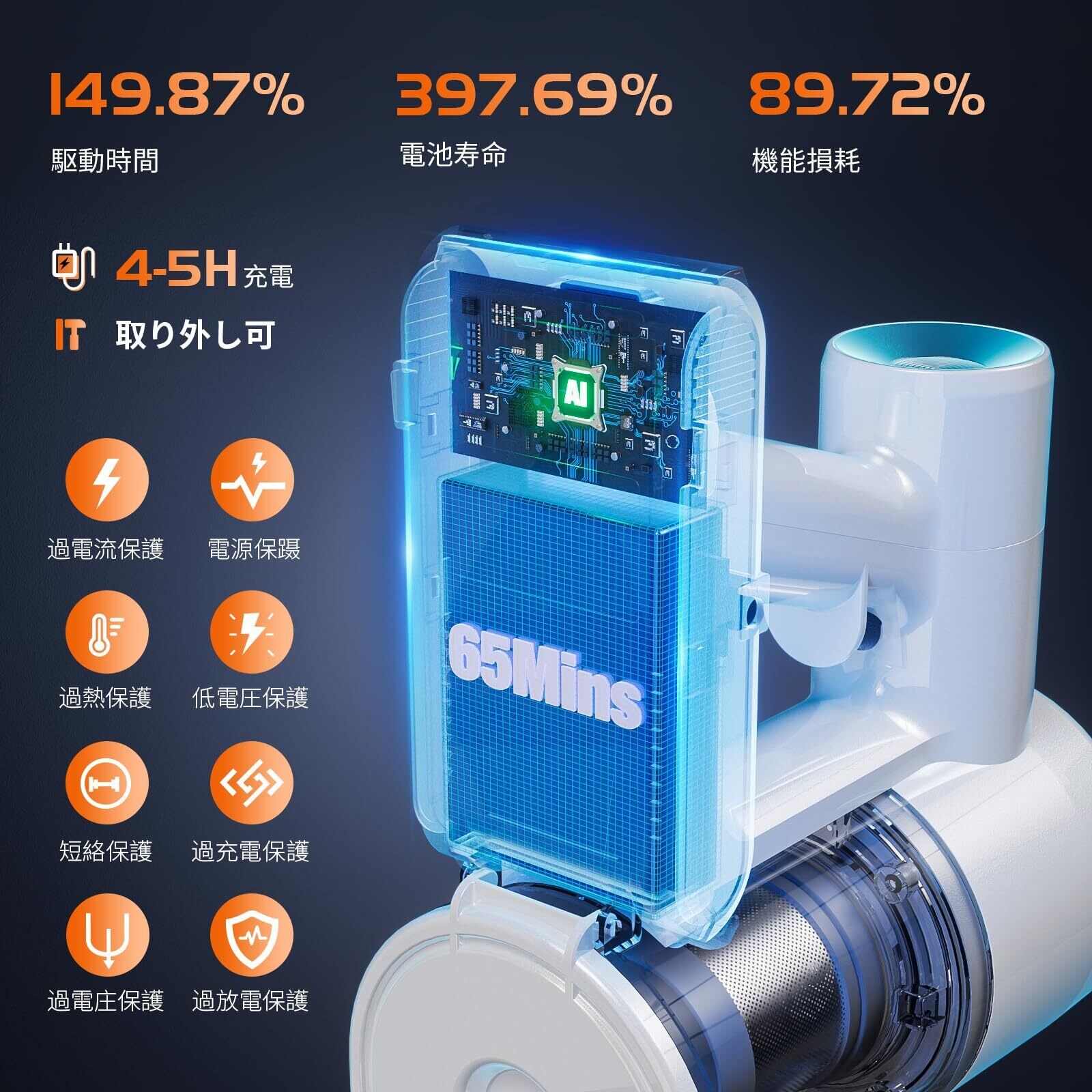 【65分長時間連続稼働&大容量着脱式バッテリー】手軽さと充実のお掃除性能を両立したコードレス掃除機は、進級版大容量着脫式バッテリーを採用し、一回満充電後は最大65分間の連続使用が可能!コードレス掃除機で家全体を一気に掃除できる!急速充電、約4時間でフル充電でき。サイクロン掃除機の予備バッテリー(別売り)を使えば、稼働時間倍増し、1DKのひとり暮らし家から、一戸建ての家まで一気に掃除できます。 また、着脫式バッテリーなので単独で充電することも、本体に取り付けたまま充電することもできます。このスティッククリーナーは3つの充電方法があり、非常に便利!
