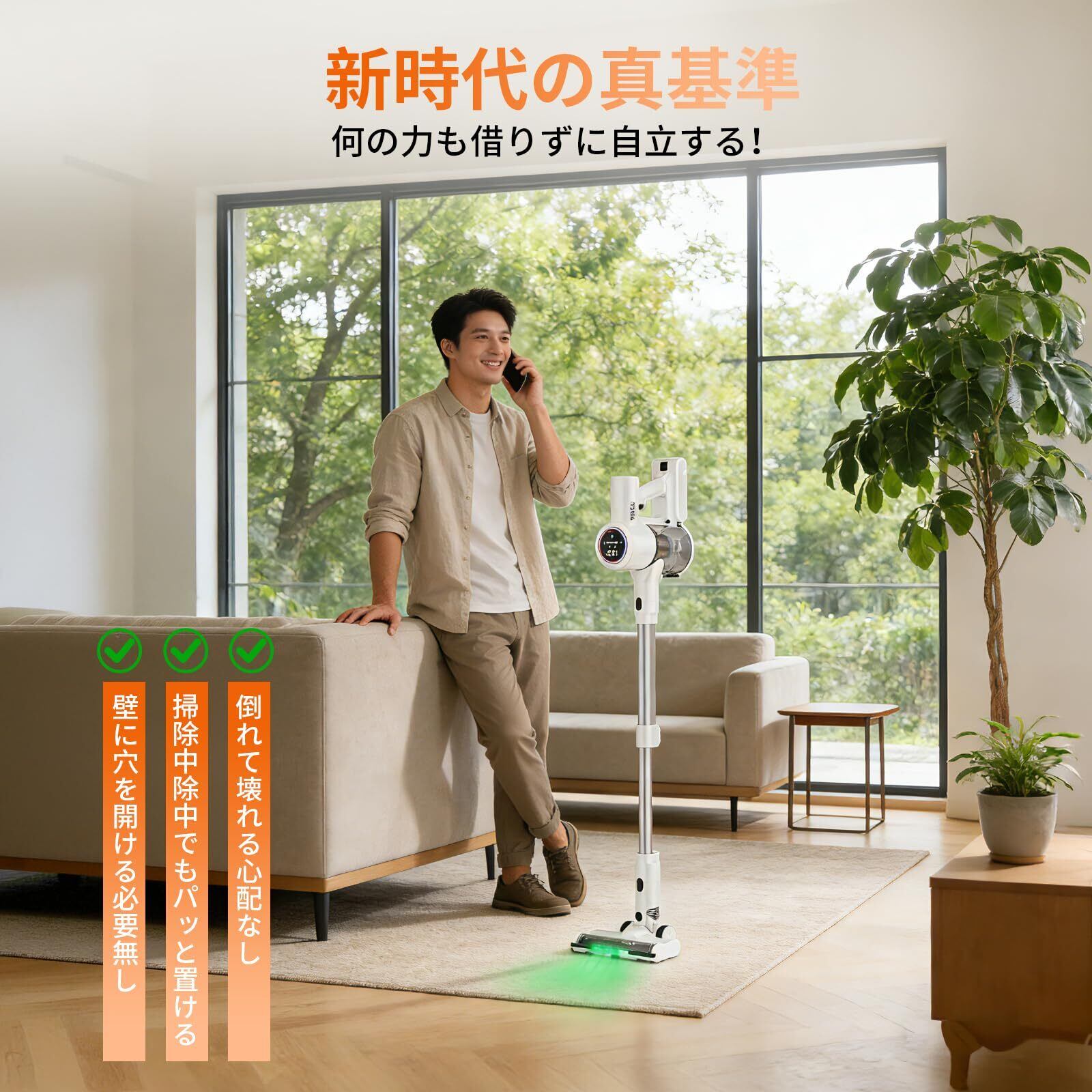 【革新版!自立式設計&人体工学伸縮設計&充電スタンド】掃除機は自立式デザインで掃除の途中で手を離しても安心です。市販の自立式掃除機は少し方向を変えただけでヘッドは浮くしまう、毎回足で踏む必要があります。いつでもどこでも立てる!コードレスクリーナーは人間工学に基づいた基本的な設計の伸縮可能なパイプ付き、身長に合わせて細かく調整することに掃除できます。掃除機がおわたっらスタンドに戻すことで自動的に充電が開始され、必要な時にすぐに使えマス。