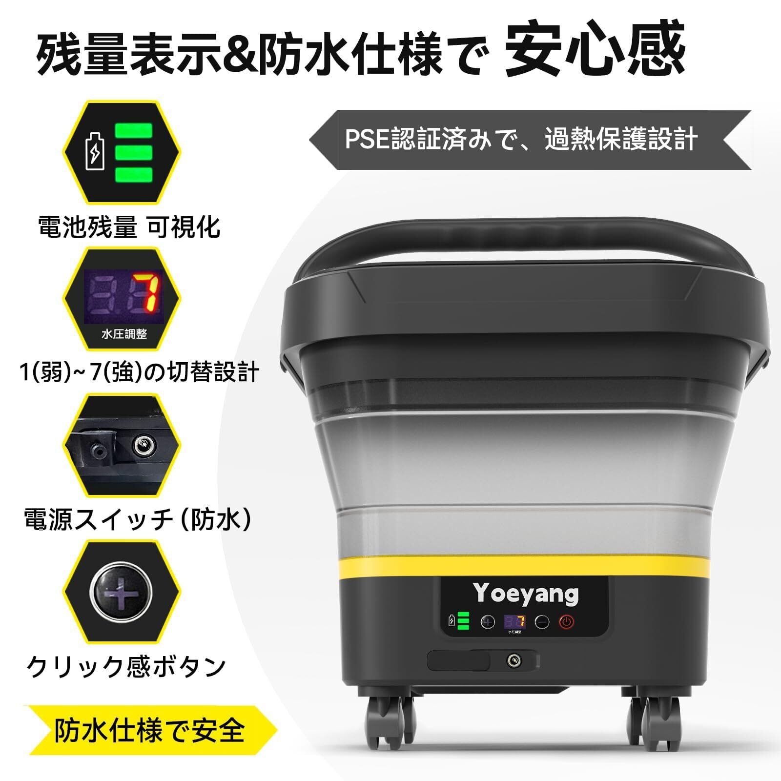 【7段階水圧調整・バッテリー残量表示・最大35分連続使用可能】Yoeyang充電式高圧洗浄機は、1~7段階の水圧調整が可能で、操作が簡単。クリック感のあるボタン設計で誤操作を防止します。トリガーガンにもロックスイッチを装備、うっかりミスな操作も防止でき。バッテリー残量表示機能を搭載し、残量をリアルタイムで確認可能、清掃中の突然の電源切れを防ぎます。内蔵の大容量2000mAhバッテリーで、満充電時最大35分間の連続使用が可能、家庭の日常清掃に十分な性能です。IPX5防水設計により、屋内・屋外問わず安心して使用できます。商品到着後は、最適な使用感と洗浄効果を得るため、まずは満充電してください。バケツを全体的に水に入れることをやめてください。※商品到着後は、製品本来の使用効果を発揮するため、必ず電池を完全に充電してからご使用ください。