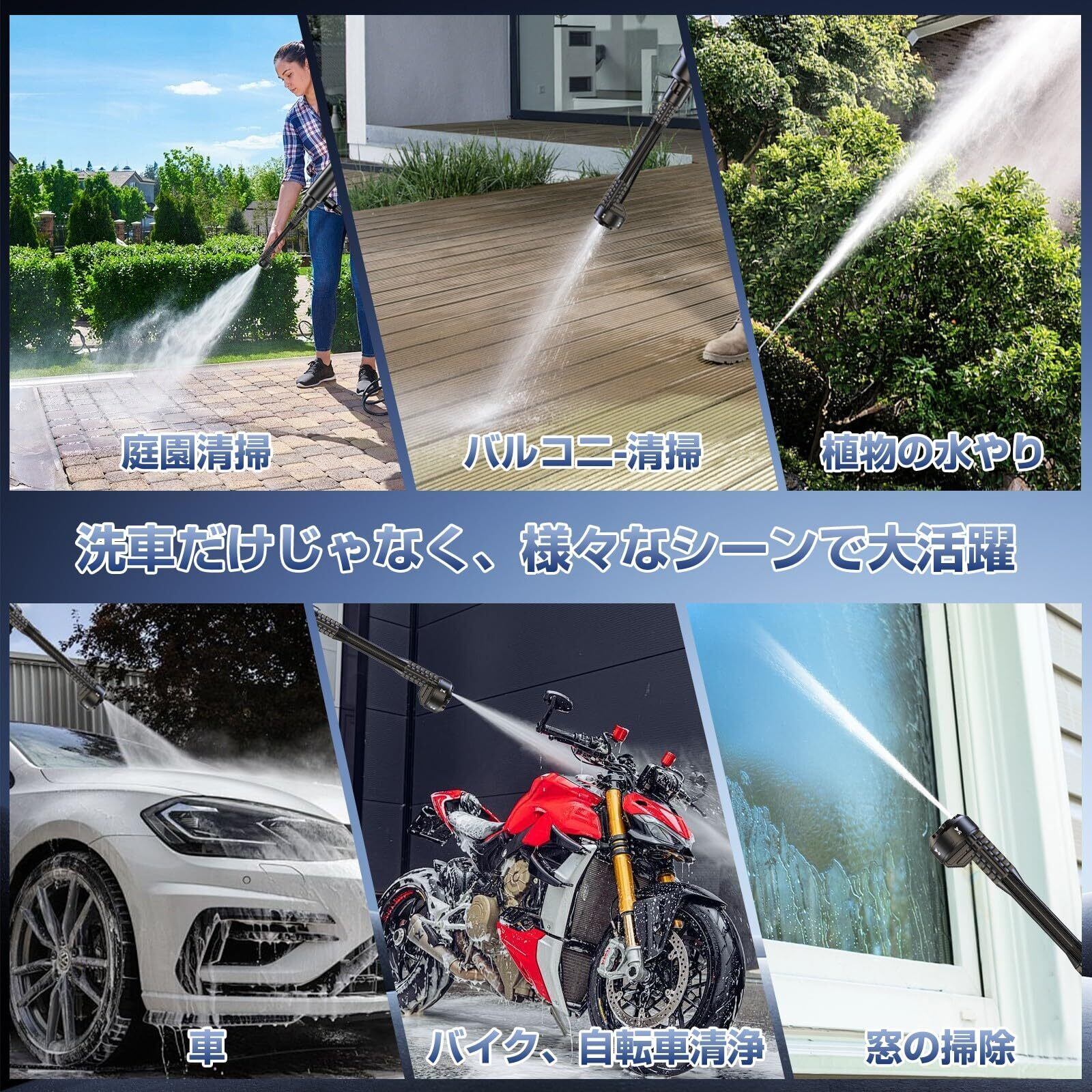 【進化版6in1多機能ノズル】標準装備の進化版6in1ノズルは、0度の直噴(上向き使用可)、15度・25度・40度のスプレー、そして拡散スプレーモードの切り替えがワンタッチで可能。用途に合わせて簡単に水流を調整でき、細かな汚れから広範囲の洗浄まで1台で対応します。アップグレードされた六角形厚手フォームボトルは耐久性とデザイン性を兼ね備え、きめ細かい泡をしっかり生成。洗車、マンションのベランダや窓掃除、車・バイク・自転車のメンテナンス、大掃除、キャンプやBBQ器具の洗浄、庭の散水、浴室や室内の汚れ落とし、農作物の泥落としや墓石の苔掃除、農業機器の洗浄まで幅広く活躍し、家庭のあらゆる清掃シーンに対応します。