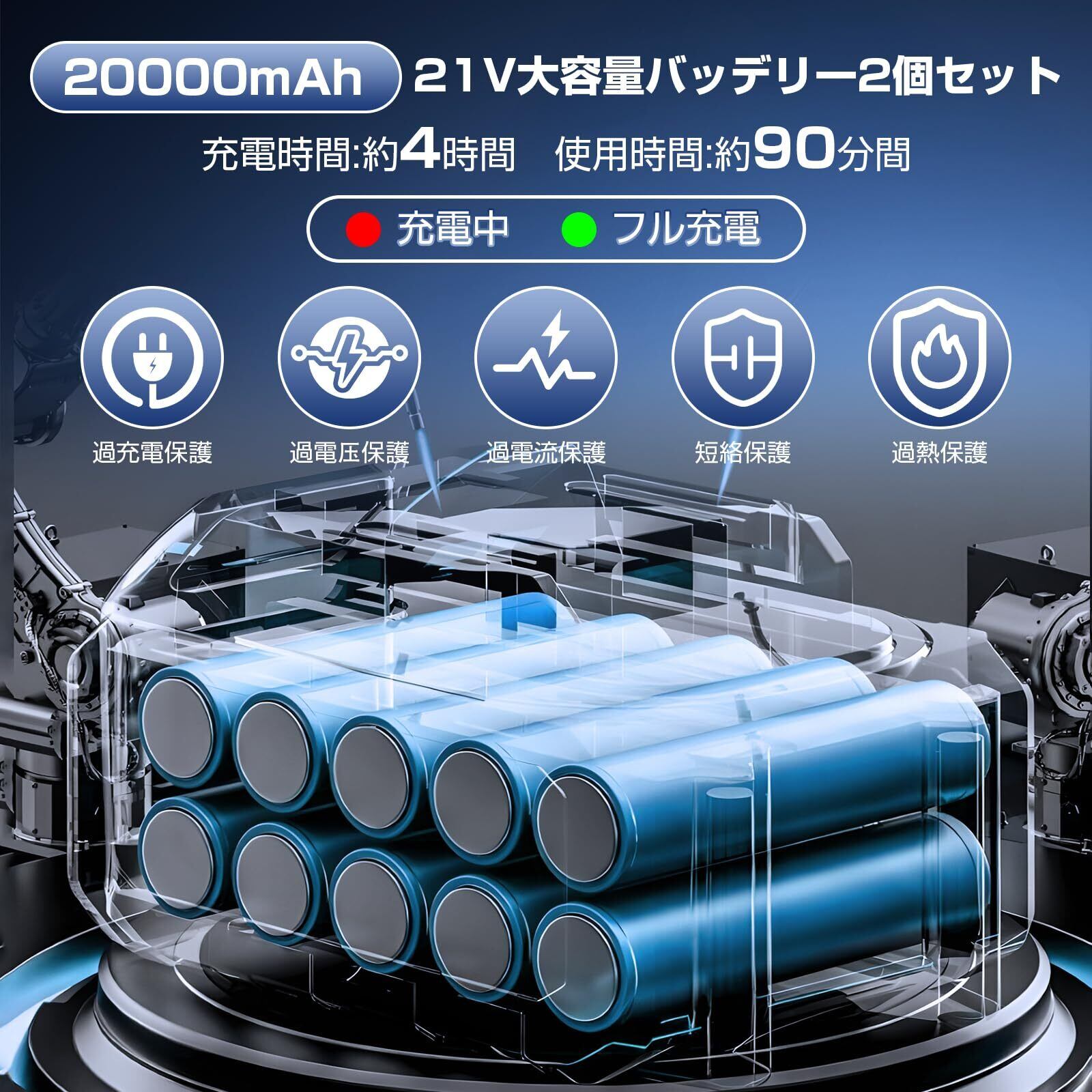 【20000mAh大容量バッテリー搭載&マキタ18V互換】コードレス仕様で電源のない場所でも自由に使える充電式タイプ。新技術採用のリチウム電池で電力効率が向上し、最大90分間連続使用が可能です。洗車、庭掃除、ベランダ清掃など幅広く活躍。マキタ18Vバッテリー(電圧18〜21V・電流11〜12A範囲内)とも互換性あり。※安全のため、初回使用前にはフル充電をおすすめします。