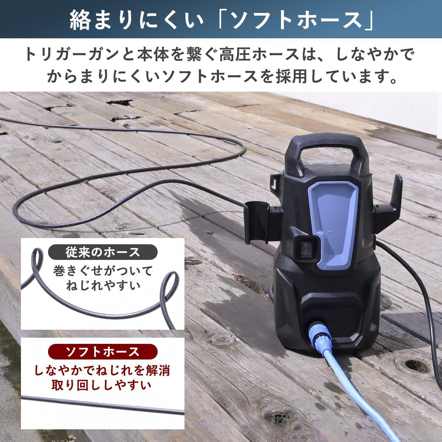 【絡まりにくい「ソフトホース」】トリガーガンと本体を繋ぐ高圧ホースは、しなやかでねじれを解消しやすいソフトホースを採用しています。絡まりにくく、取り回しもしやすい仕様です。