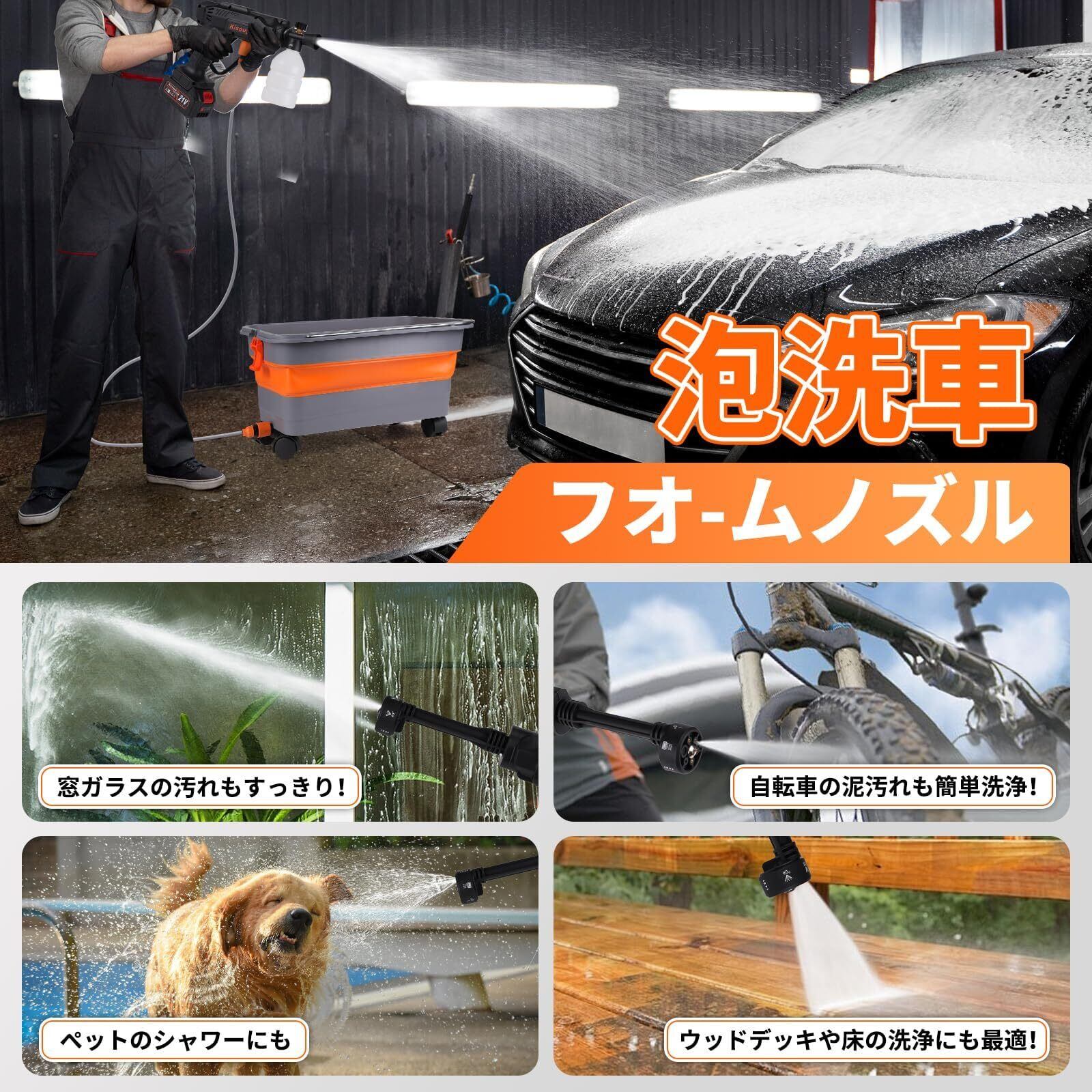 【6種類の噴射モード&泡洗浄対応】 Kisouya高圧洗浄機は、用途に応じて切り替え可能な6-in-1マルチノズルを搭載。 0°・15°・25°・40°・拡散モード・シャワーモードの6種類の噴射モードで、洗車から家庭のあらゆる清掃作業まで柔軟に対応します。 さらに、洗剤を入れるだけで濃密な泡を噴射できる泡フォームノズルも付属。頑固な油汚れや花粉、黄砂、塩害、カビ・苔汚れの除去に最適です。 まるで業務用のような本格的な洗浄体験をご家庭で簡単に実現できます。 【ポータブル高圧洗浄機|多用途対応・1台で家中まるごと清掃】 この1台で、以下のようなシーンに対応可能: ● 自動車・バイク・自転車の洗車 ● ベランダ・玄関・外壁・窓ガラス・網戸・浴室・階段・駐車場・コンクリ壁・門柱 ● キャンプ用品・BBQコンロ・園芸工具の清掃 ● 花粉・黄砂・梅雨時のカビ・苔・砂汚れの除去 ● 年末の大掃除やアウトドア後の後片付け コードレス・高圧・多機能ノズルの組み合わせにより、ご家庭に1台あるだけで、掃除がぐっとラクに、効率的になります。