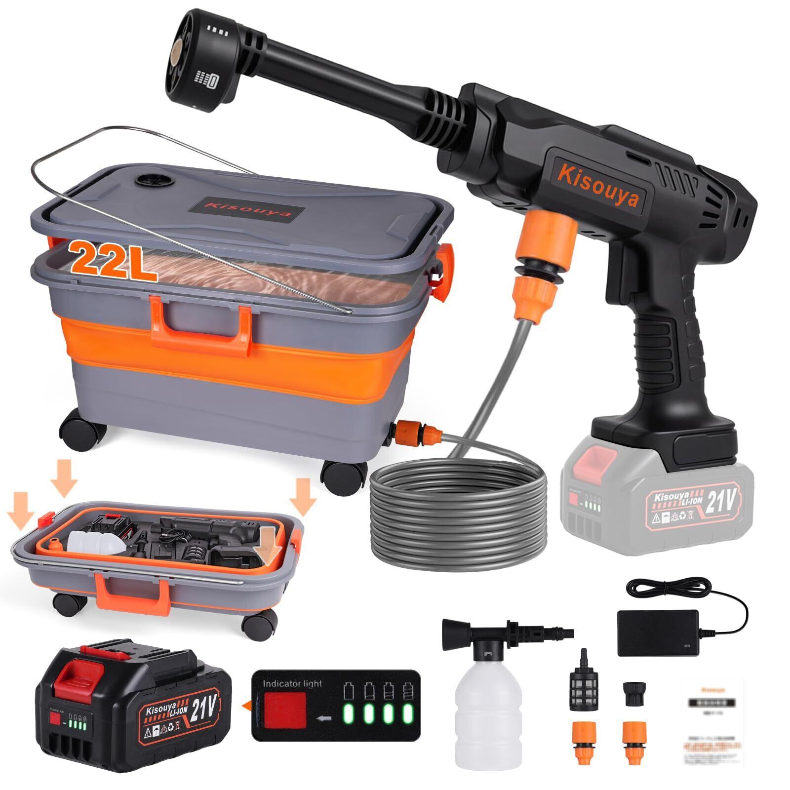 【品質検査、安心】 すべての製品は出荷前に厳格な品質検査を受けています。初回使用時に少量の水滴が残る場合がありますが、これは動作検査のためであり、製品の性能には影響しません。【移動が楽なコードレス高圧洗浄機 22L折りたたみバケツ付き・場所を選ばず使用可能】 Kisouyaコードレス高圧洗浄機には、便利な22リットル大容量の折りたたみ式バケツが付属。使わないときはコンパクトに折りたためて、収納も持ち運びも簡単。別途バケツを購入する必要がありません。 さらに、付属のペットボトルアダプターを使えば、市販のペットボトルからも給水が可能。これにより、キャンプ場・山間部・洗車場など、水道がない場所でも気軽に使用できます。 また5m吸水ホースと重量付きフィルターを標準装備。川の水・雨水・お風呂の残り湯・湖水など、さまざまな水源を利用可能で、しっかりと異物を取り除きながら、安全に使用できます。水道代の節約にも◎! ※対応水温は0~40℃。