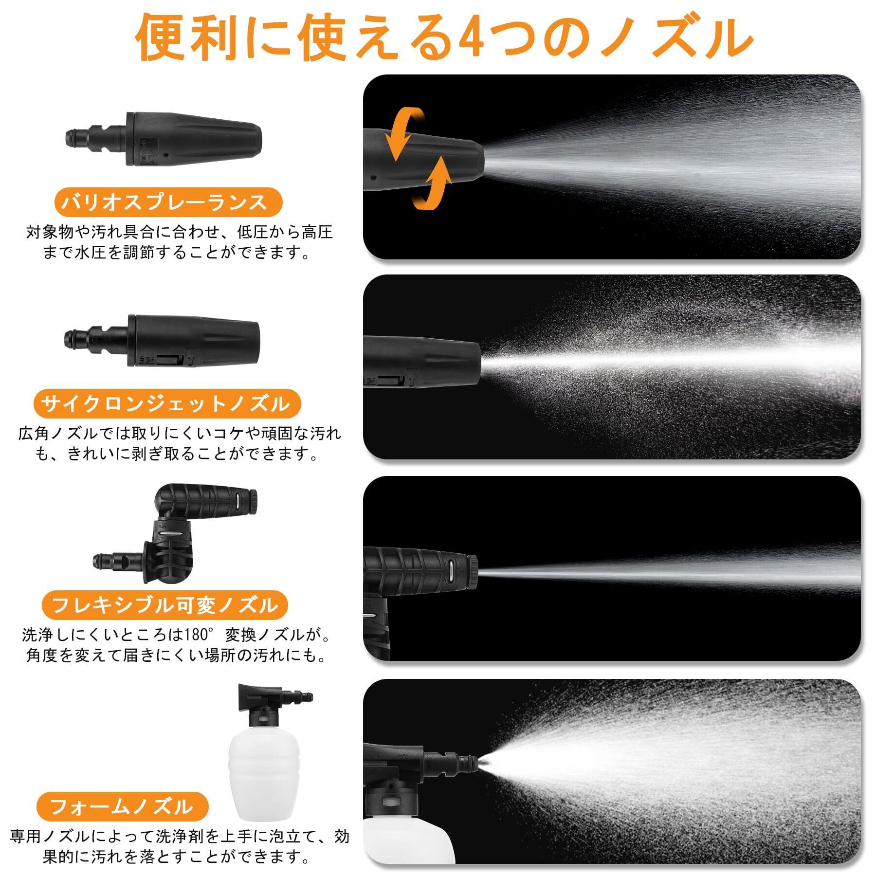 【 多機能使用 】普段使いの洗浄にバリオスプレーランス対象物や汚れ具合に合わせ、低圧から高圧まで水圧を調節することができます。頑固な汚れの洗浄にサイクロンジェットノズル広角ノズルでは取りにくいコケや頑固な汚れも、きれいに剥ぎ取ることができます。洗浄しにくいところは180°変換ノズルが。角度を変えて届きにくい場所の汚れにも。洗浄剤を泡状噴射!洗車にフォームノズル専用ノズルによって洗浄剤を上手に泡立て、効果的に汚れを落とすことができます。