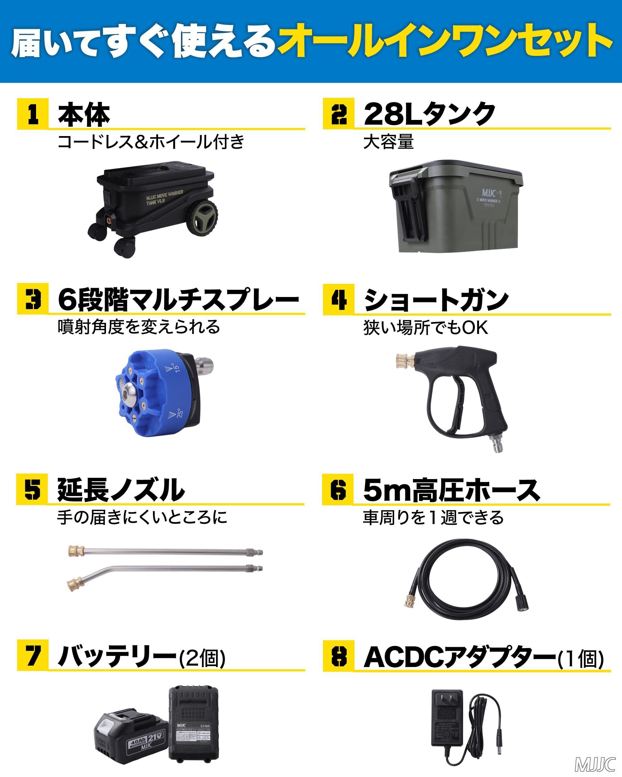 セット内容:高圧洗浄機本体、大容量28Lタンク、洗車に便利なショートガン、6段階マルチスプレー、足回りやルーフの洗浄に便利な延長ノズル、5メートル高圧ホース、バッテリーパック2個(PSE認証済)、ACアダプター1個(PSE認証済)、日本語説明書・書が付属。