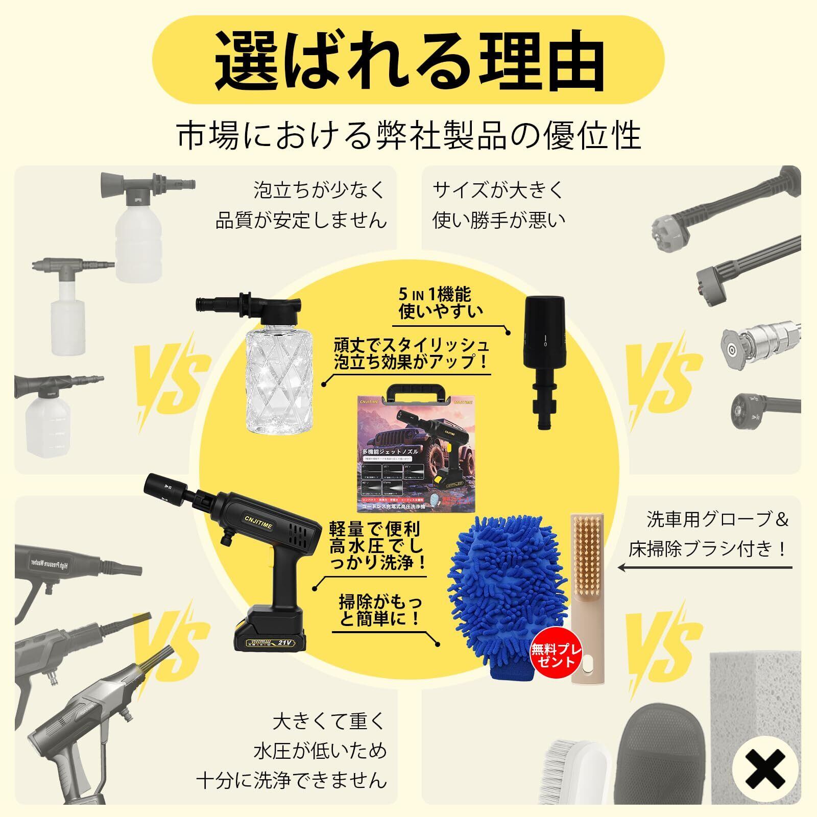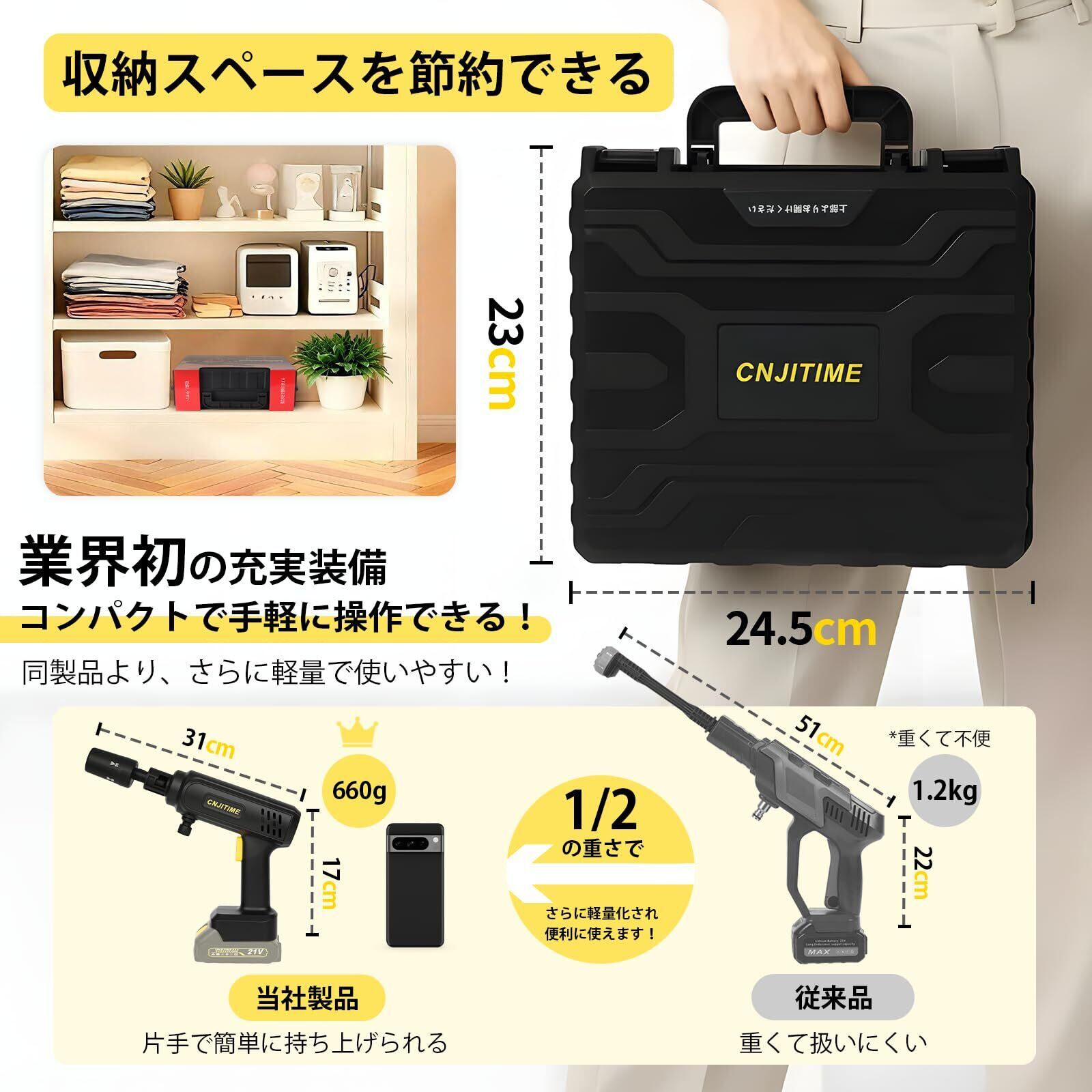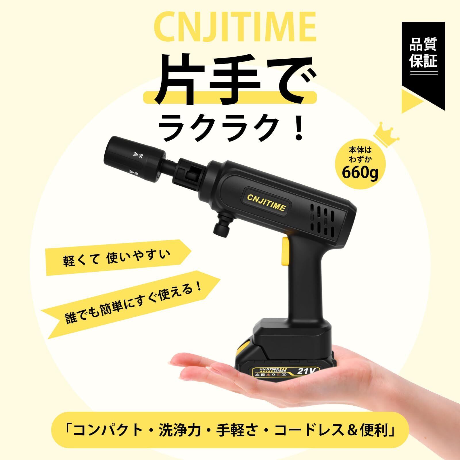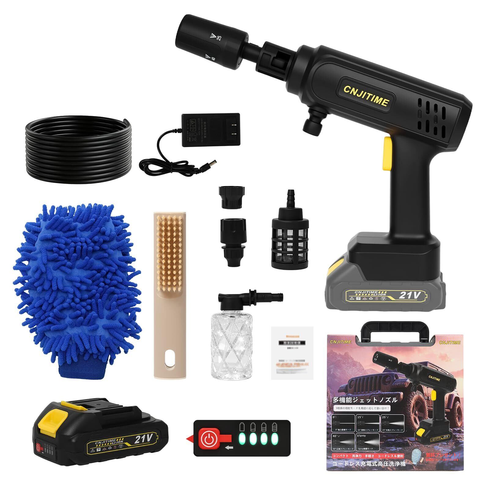 【すべての製品は出荷前に100%検品 & 豊富な適用シーン】CNJITIME コードレス充電式高圧洗浄機。すべての製品は出荷前に100%検品を実施しており、初回使用時に内部テストで生じた微量の水分が残っている場合がありますが、これは正常な現象であり、製品の品質には全く問題ありませんので、安心してご使用ください。製品は購入日から2年間の長期が付いており、安心してご使用いただけます。セット内容は、高圧洗浄機本体、1個のバッテリー、充電器、5in1ノズル、フォームノズル、5メートル給水ホース、フィルター、ペットボトル用給水アダプター、収納ケース、日本語説明書、さらに洗車用グローブと床掃除ブラシが付属しています。万が一、付属品の不足やご使用中に問題が発生した場合は、どうぞお気軽にカスタマーサポートにご連絡ください。24時間以内に迅速に対応し、必要に応じて無償で部品をお送りします。製品だけでなく、全てのサポートも提供し、使用中の安心をお約束します。付属の多機能アクセサリーで、家庭用からアウトドア、冬の雪解けや年末の大掃除まで、さまざまな清掃シーンに柔軟に対応します。CNJITIMEブランドの高圧洗浄機をお選びいただき、ありがとうございます。