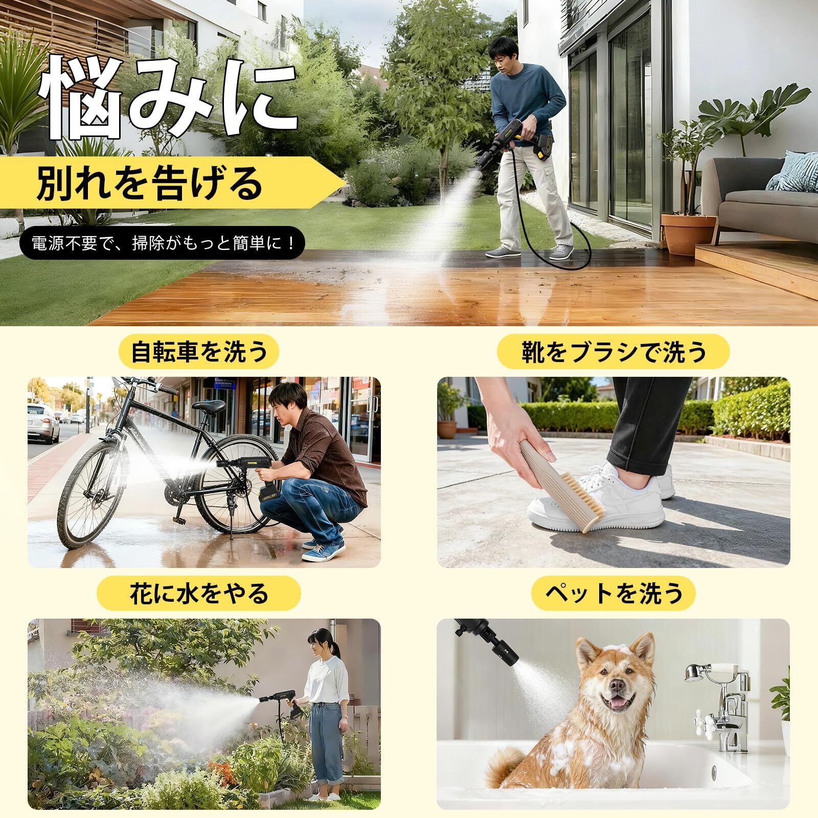 【最新型5in1多機能ノズル & 最新型強化透明泡ノズル】CNJITIME モバイル高圧洗浄機。全新アップグレードされた専用強化5in1多機能透明ノズルと最新型強化透明泡ノズルは、驚くほど高密度で均一な「濃厚泡」を生成します。これらの泡は汚れの細部までしっかり浸透し、浮き上がらせた後は高圧水流で徹底的に洗い流します。「泡による浸潤+高圧洗浄」のダブル効果で、愛車やガレージもピカピカに。強化された5in1多機能ノズルは、強力な0°ジェットで頑固な泥を簡単に撃退。15°、25°、40°ノズルを使用すれば、広い面積の床やフェンスも素早く清掃できます。シーンに応じて、優しい水拭きやペットの洗浄、植物への水やりなど、簡単に切り替え可能です。さらに、付属のバケツや空のペットボトルも即席の給水タンクとして利用でき、アウトドアでの車の泥落とし、ベランダ掃除、棚小屋の手入れなど、清掃をより簡単で楽しいものにします。※ご注意:本製品は自吸式設計のため、給水システムを直接接続した場合、高圧洗浄機本体のスイッチで水流を制御することはできません。あらかじめご了承ください。