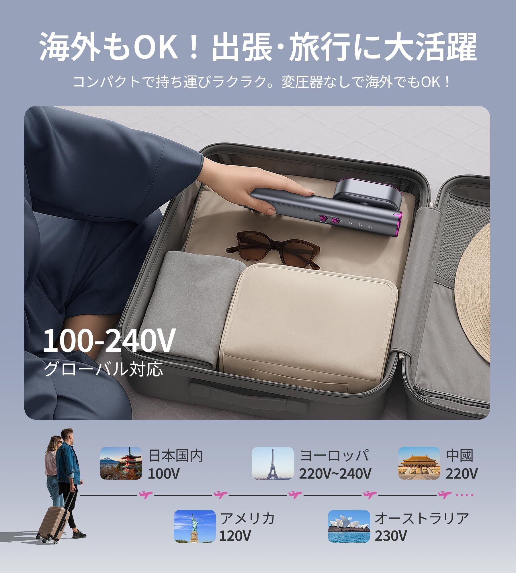 【海外対応の携帯アイロン、出張・旅行に大活躍】スリムにデザインされたPursay衣類スチーマーは、スーツケースもすっきり収まり、荷物が多い出張や旅行でもかさばらず、専用収納ポーチ付きで持ち運びにも快適。AC100-240V対応で、変圧器なしでも海外で安心して使えます(※プラグ形状が日本仕様のため、現地対応の変換プラグが必要です)。出発前の5分でサッとシワを整え、商談やプレゼンでも清潔感のあるプロフェッショナルな印象に。旅先での写真撮影や特別な予定にも、美しい装いで思い出を残せます。