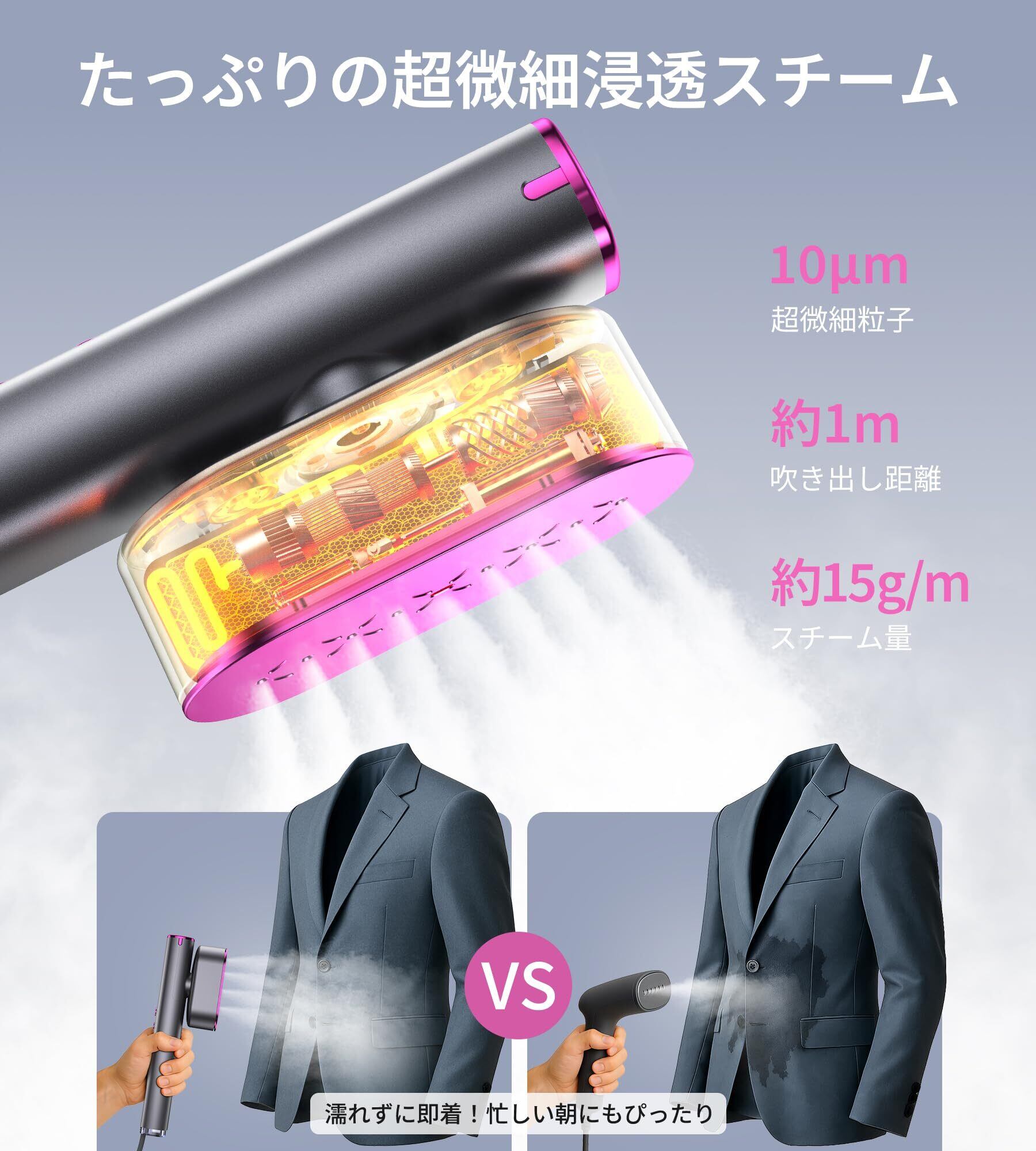 【濡れずに即着!忙しい朝にもぴったり】Pursayハンディスチーマーは、先端加圧ヒートチャンバー、三層スチーム加熱システム、7つのスチーム吹出口を搭載し、最大100cmまで届くパワフルな超微細スチームを発生。強力な浸透力で効率よくシワを伸ばし、衣類が濡れず、すぐに着られます。30秒で立ち上がり、忙しい朝でも5分でシワを素早く伸ばして、出かける準備が整います。120mlの水タンクは10分間連続使用可能で、頻繁な水補充の手間も省けます。