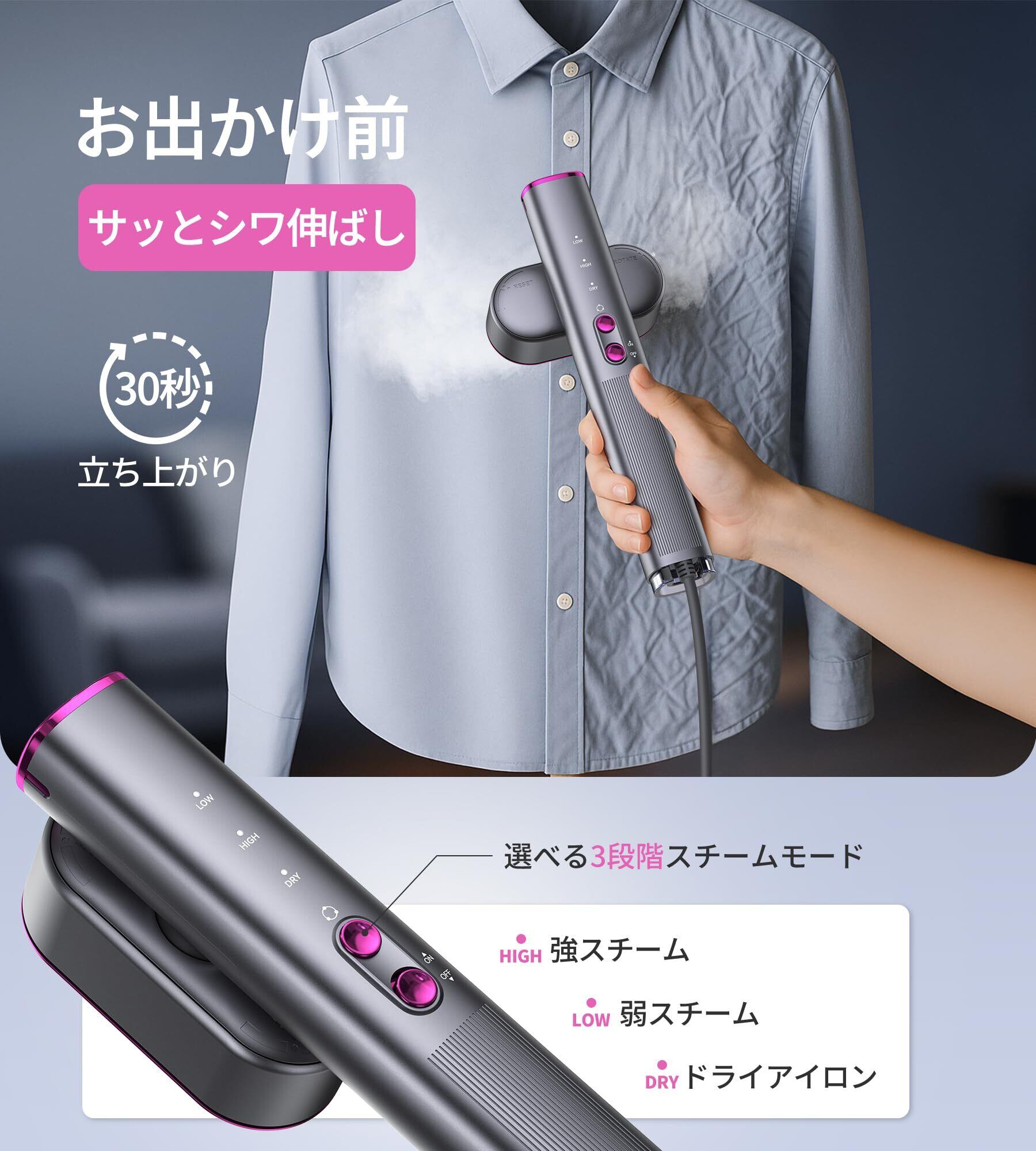 【多種モード搭載、プロ級の仕上がりに】Pursayスチーマーアイロンは、ハンガーに掛けたままで使える衣類スチーマーとしてはもちろん、普通のアイロンとしても使用可能です。さらに、素材や頑固なシワに最適な強スチーム(15g/分)、薄手の夏服や日常ケアに便利な弱スチーム(12g/分)、折り目付けに最適なドライモードの3種類のモードを搭載。繊細なブラウスから厚手のジャケットまで、季節を問わず最適なケアが実現できます。プロに頼らず、自宅で手軽に美しい仕上がりを提供します。