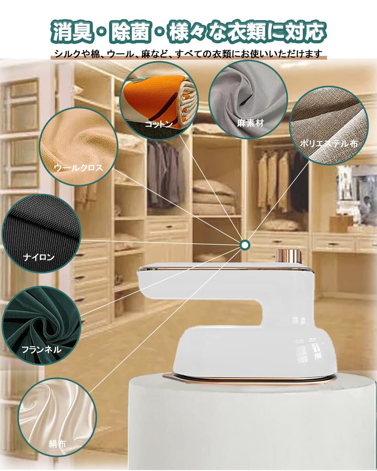 【消臭・除菌・様々な衣類に対応】さまざまな衣類対応可能。シルクや棉、ウール、麻など、すべての衣類にお使いいただけます。洗うのが難しい衣類などに使うのがおすすめ!衣類だけではなく、布製家具の除菌・消臭・シワ取りに活用でき、ブランケット・カーテン・ラグなど、簡単に洗えないアイテムもお手入れ可能。衣類に付いているタバコ、汗などの臭い匂い、または昆虫、花粉などのアレルギー物質対策の除菌、消臭効果もあります。「アイロン不可」の表示がある材料は使用しないでください。革製品類には使用できません。
