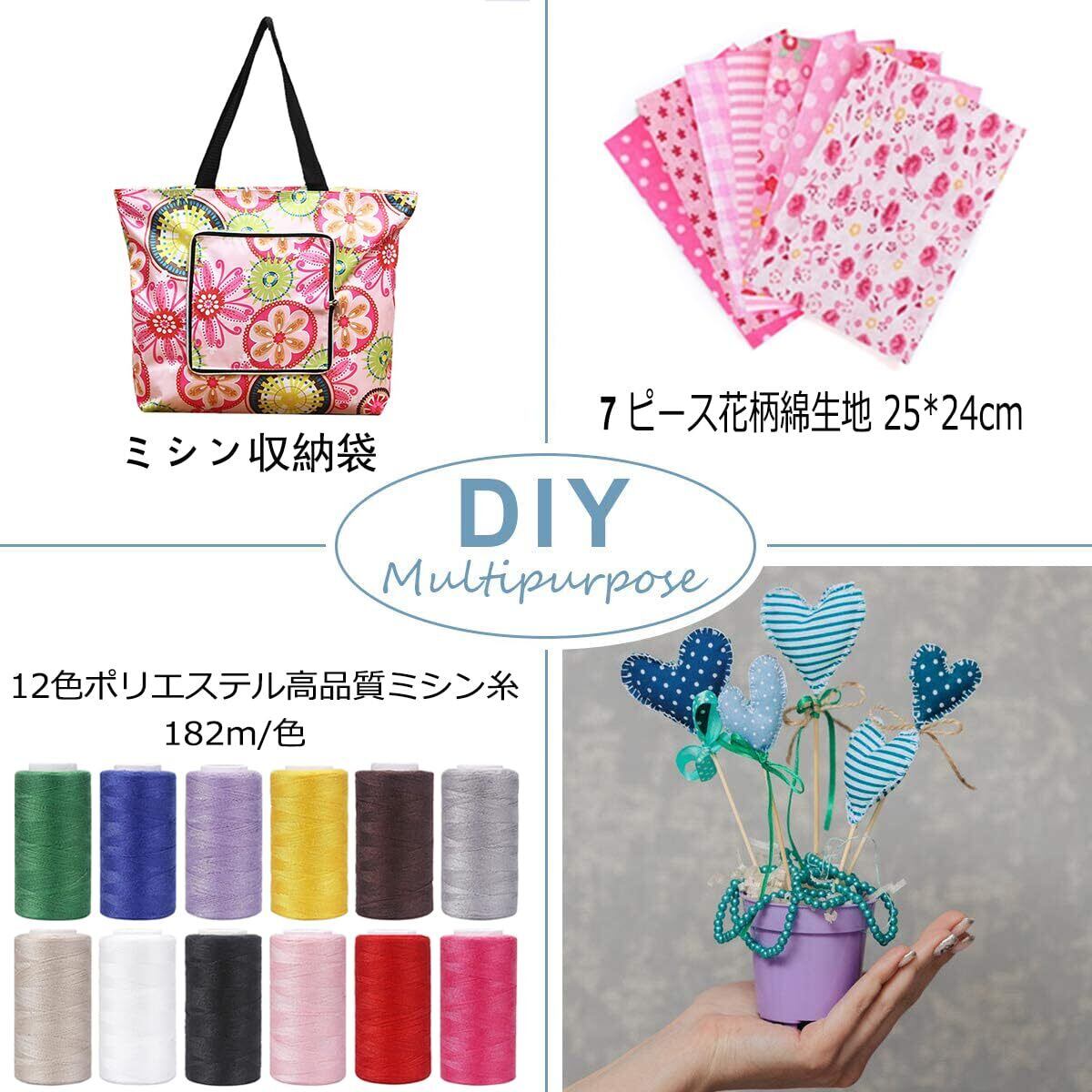 【パーフェクトホームミシンセット】ミシン収納袋 、コットン生地、12色ミシン糸、縫製に必要なアクセサリーが揃っています。余分なお金や時間をかけずに購入できます。 これらのアクセサリーは別売りですが、このミシンセットを購入すれば簡単に手に入ります!