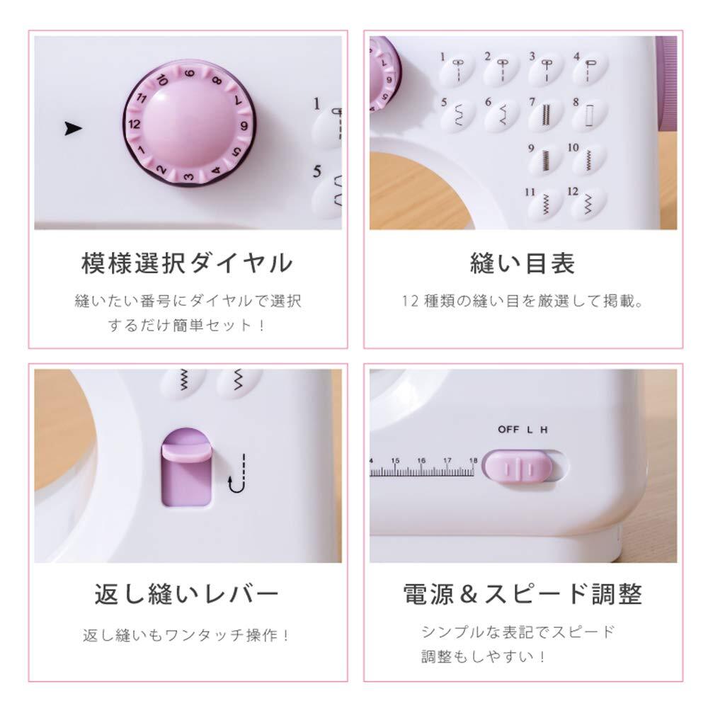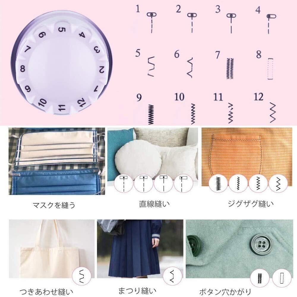 電動ミシン コンパクト家庭用ミシンセット 初心者 12種の縫い目 小型 ミニ ポータブル 低騒音 返し縫い フットコントローラー スピード可調整 収納袋 DIYコットン柄の織物7枚 12色ミシン糸 日本語取扱説明書付き (紫白色)