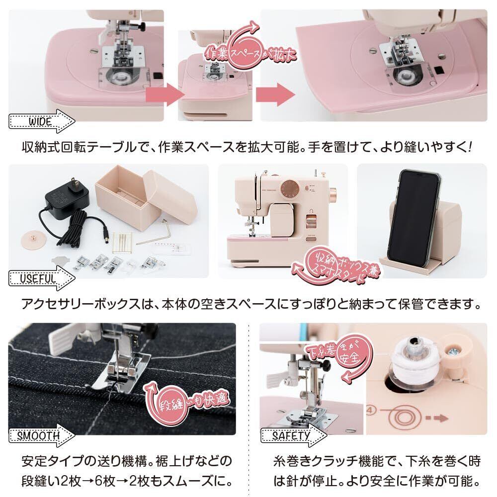 【付属品】ACアダプター、糸コマ押え、針×3本、ボビン×2個、ボタンホール押え、針板ドライバー、スムース押え、縁かがり押え、ガイド押え、まつり縫い押え、ファスナー付け押え、直線縫いガイド、気分がアガるレシピ、アクセサリーボックス/スマホスタンド、QRコードシール、取扱説明書、書