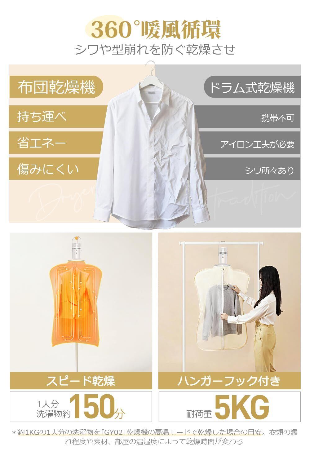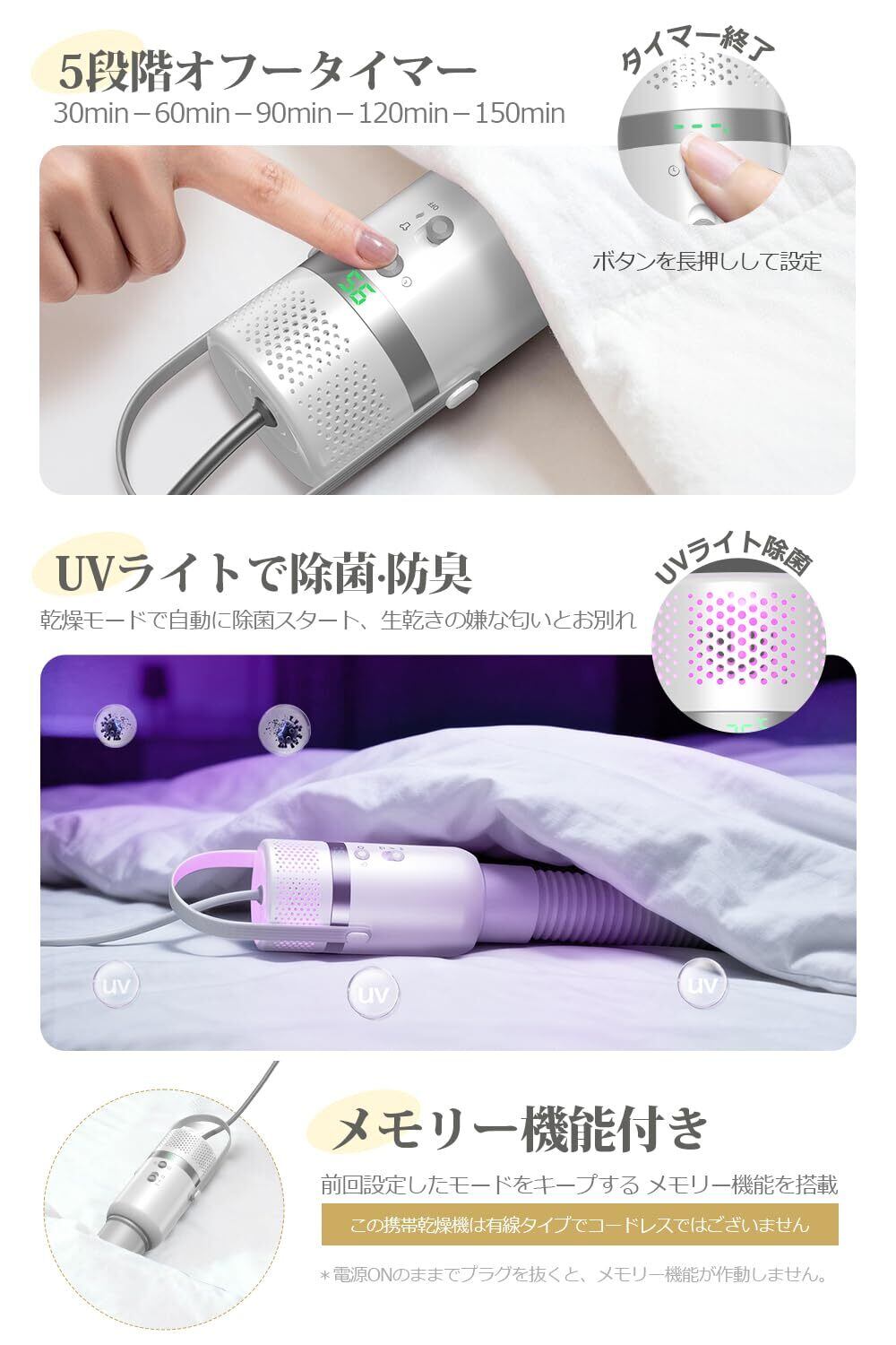 【MAX1000W速乾速暖を実現・UV除菌ライト搭載】小型でありながら、MAX1000Wのパワフル温風を吹出し、寝る前に布団を約10分でしっかりと温め、心地よいぽかぽかの寝床を準備できます。衣類乾燥においても、乾燥袋内で温風が勢いよく循環して、一人分の洗濯物も約150分でスピード乾燥、洗濯物がなかなか乾かないイライラ感を解消。さらに、乾燥モードではUVライトが自動スタート、湿気を取り除きながら除菌し、生乾きの嫌なニオイを防止するため、衣類、靴、寝具をより清潔に保つことができます。