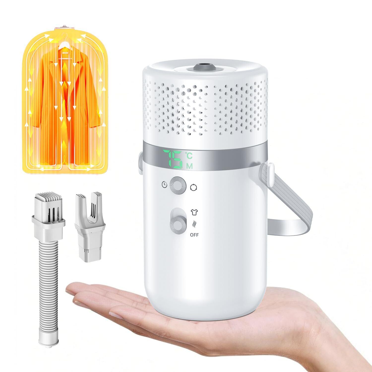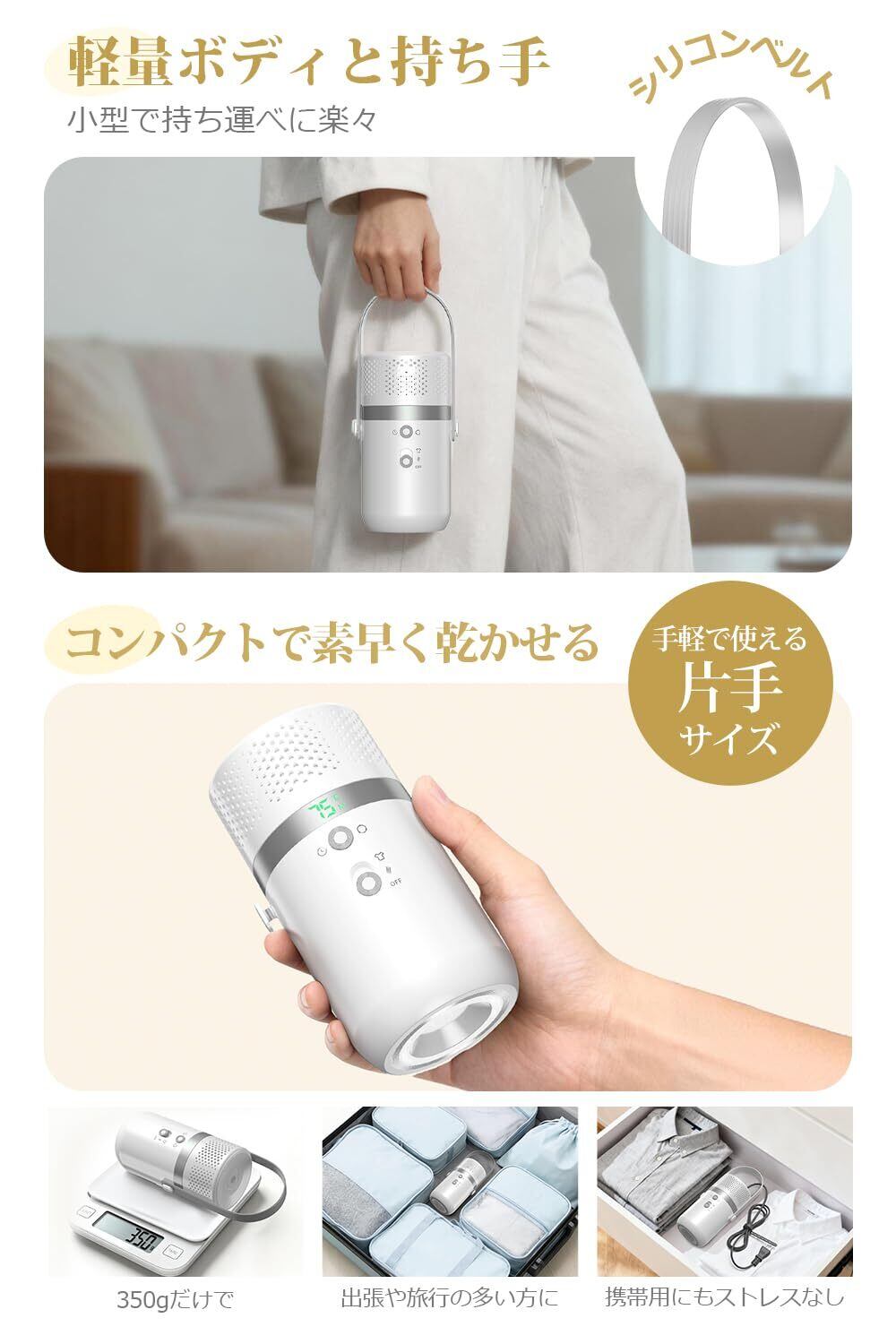 【片手サイズ&350g超軽量・一人暮ら/旅行/出張に大活躍】本体は7×14cmの手のひらサイズ、重さはわずか350g、魔法瓶ほどの大きさの小型乾燥機。片手で軽々持てるコンパクトさは、収納スペースに困らないだけでなく、準備や使用、持ち運びにもストレスがありません。一人暮らしの狭いお部屋でも、クローゼットの片隅や棚の上にさっと収納可能。軽量で持ち運びやすく、リビング、寝室、子供部屋、玄関など複数の場所で使いまわしても楽々。旅行や出張の際には荷物の隅に忍ばせておけば、洗濯物を急いで乾かしたい時などに大変便利な携帯乾燥機です。