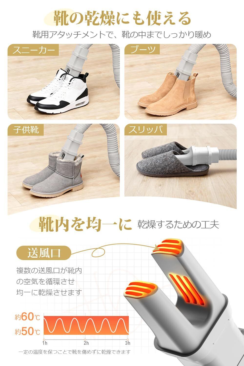 【布団/衣類/靴/ヘヤの乾燥&温め・一台多役乾燥機】日常生活のあらゆる「湿った」「冷たい」という悩みを解決する多用途乾燥機が新登場!布団用ホースは最大100cmまで延長可能、布団の中に差し込むだけで温風を届け、ぽかぽか温めはもちろん、湿気やダニ対策に効果的。衣類乾燥袋を使えば、ハンガーにかけたまま360°温風が服のすき間を巡り、シワや型崩れを防ぎながらサッと乾かせます。さらに、靴乾燥アタッチメントで汗や雨で湿った靴の中をすっきり乾燥、ノズルをつければドライヤーのように髪乾燥も可能。この一台で、季節を問わず、家中のあらゆる乾燥ニーズに応える、まさに新生活の心強い味方です。