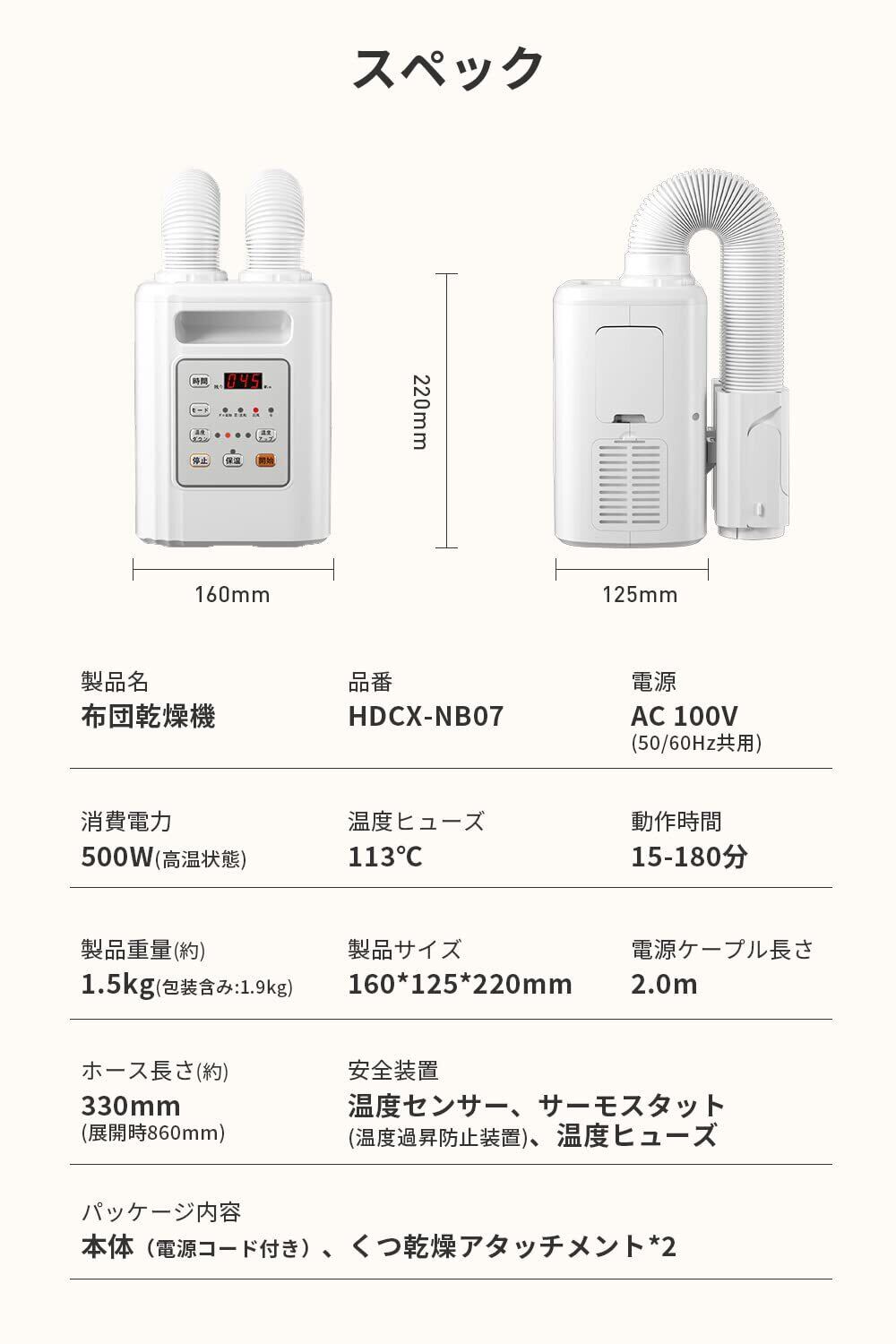 【過熱防止 安心付き】安全な温度を保つよう自動制御する温度過昇防止装置により、内部温度が上がりすぎた場合は自動的に電流を完全遮断して運転停止、安心してお使いいただけます。万が一商品に不具合がある場合は、商品ページの販売元をクリックして、「質問する」ボタンよりまでご連絡いただければ迅速に対応いたします。【パッケージ内容】ふとん乾燥機本体(電源コード&ダブルホース付き)、靴乾燥アタッチメント×2、取扱説明書(書付き)。