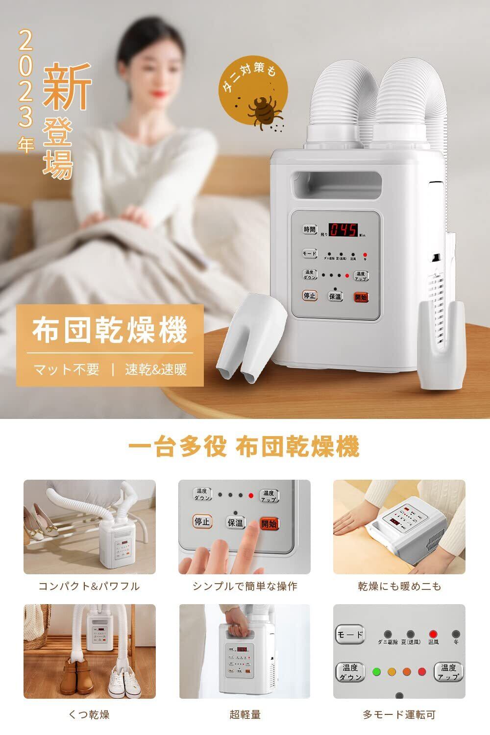 布団乾燥機 布団あたため ふとん乾燥機 ダニ退治 温風機能 4段階温度調整 9段階タイマー ツインノズル ハイパワー 衣類乾燥 靴乾燥 速乾 速暖 マット不要 ふとんかんそうき 除湿乾燥 脱臭 寒さ対策 湿気対策 梅雨対策 軽量 コンパクト 持ち運び/収納便利 (乳白色)
