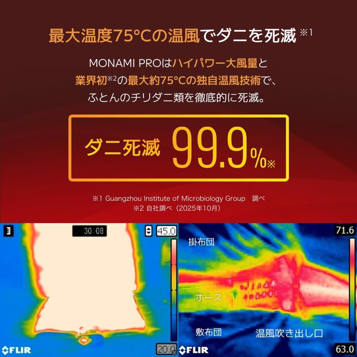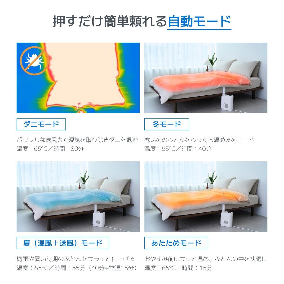 温風 × マイナスイオン:最大約75°Cの温風でダニを99.9%死滅、消臭機能も搭載で快適。温風が布団を芯から温めるとともに、強力な送風で湿気まで一掃。ふっくら快適なふとん環境へ。