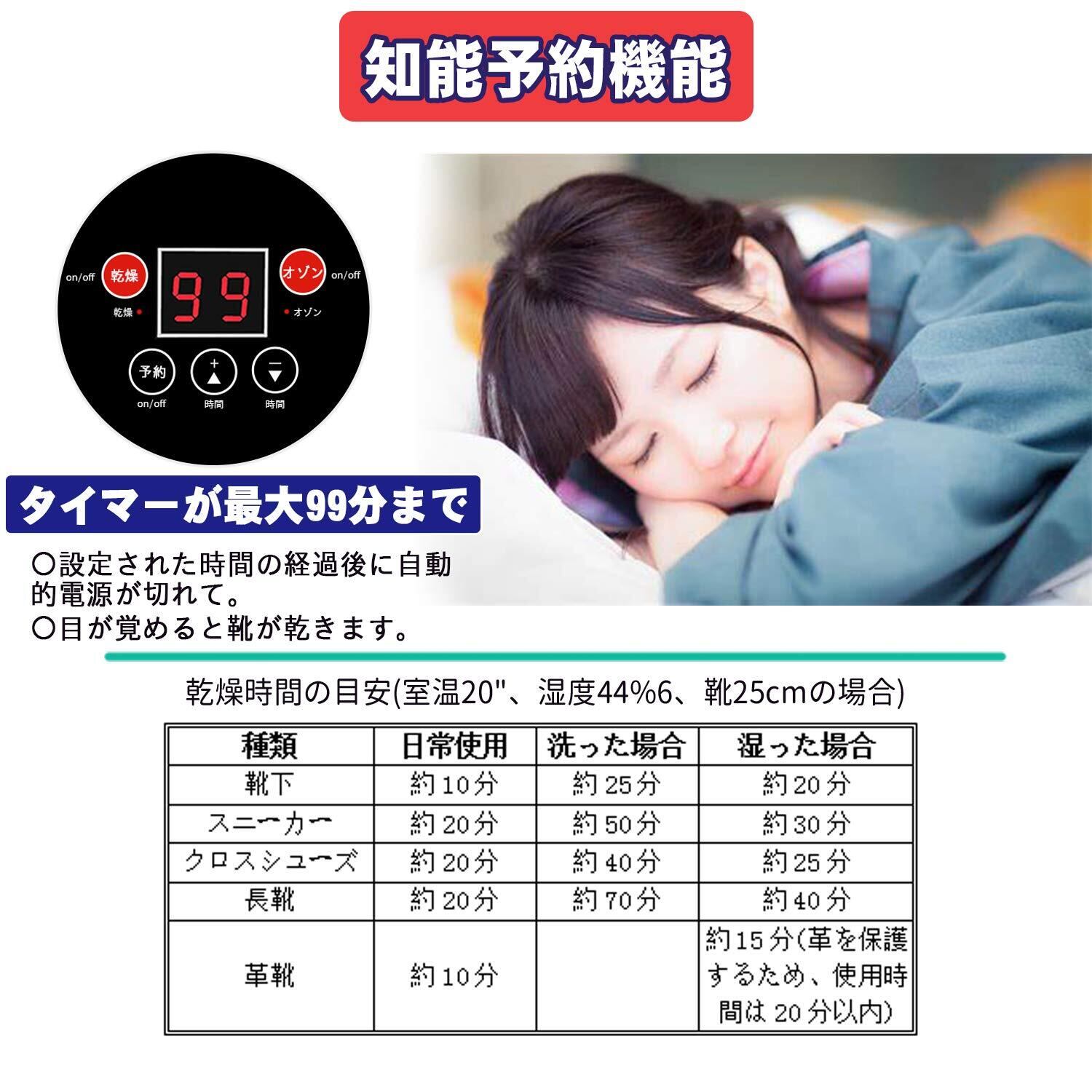 『知能予約機能』タイマーが最大99分まで、予約タイマーは動作時間と動作モード決めて最大24時間まで設定可能になっています。設定された時間の経過後に自動的電源が切れて、切り忘れの心配がなく、省エネとともに安全性の高いくです。ので湿気の状態や夜間電力の時間帯で任意使用できとても良いです。(※乾燥させすぎて大事な靴が痛むことはありません。)