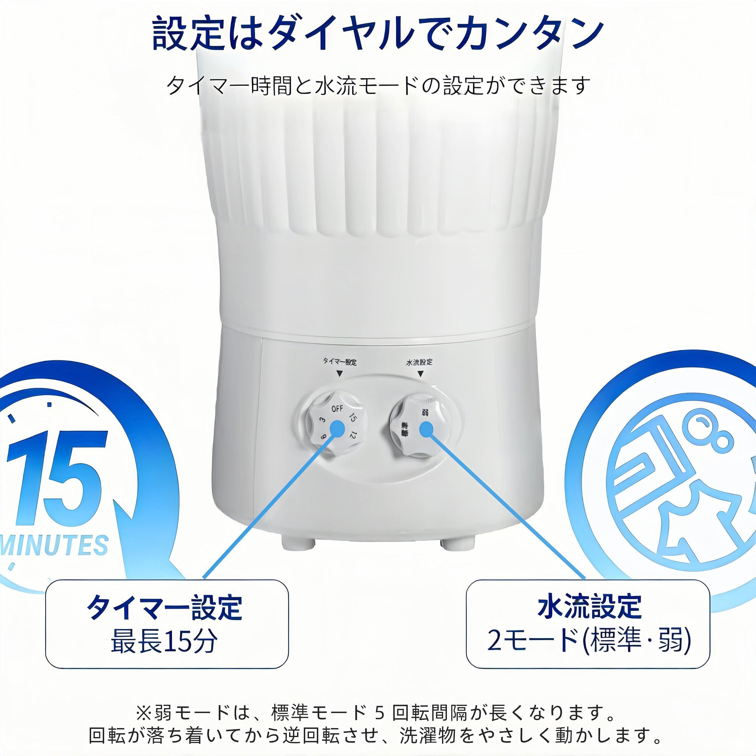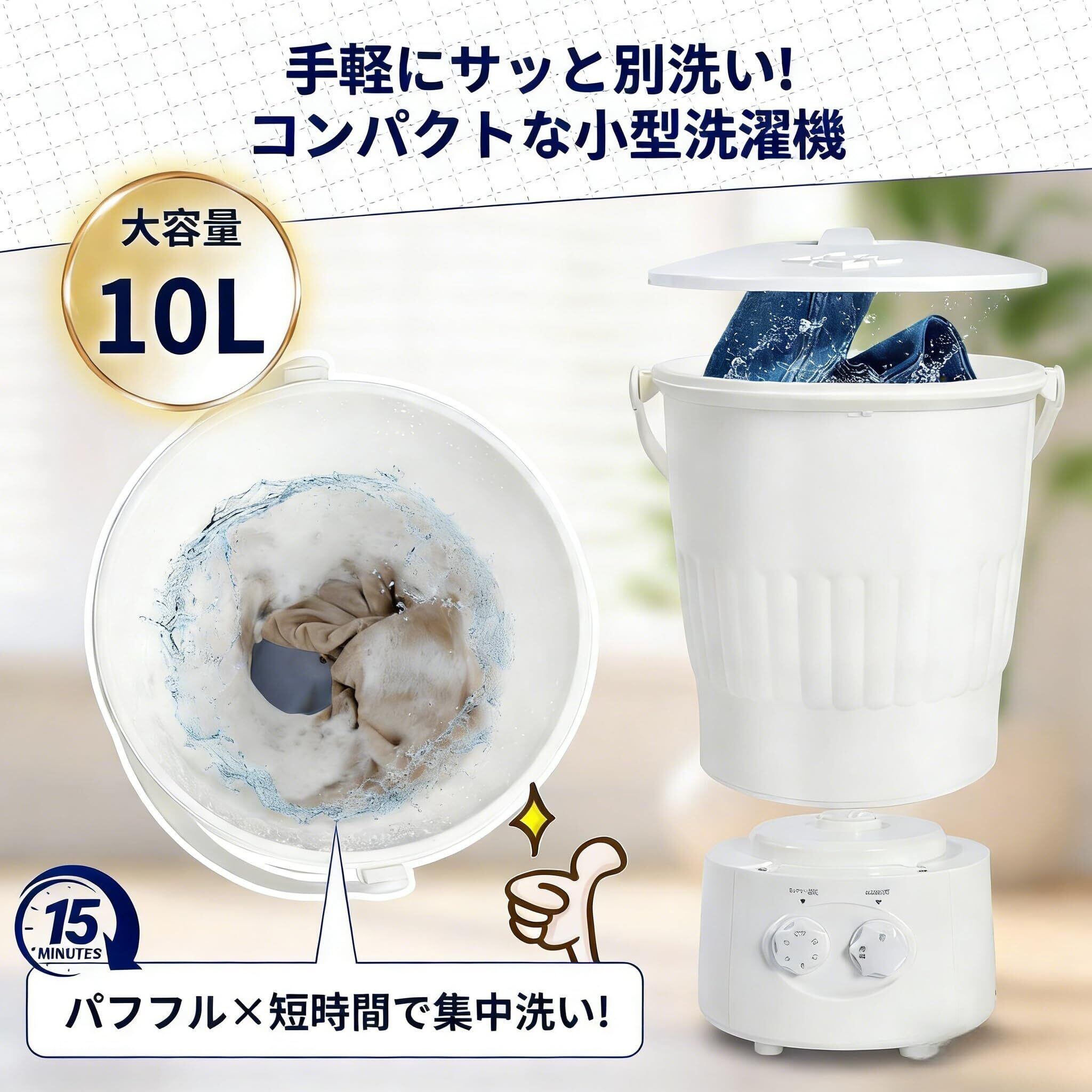 簡単操作で誰でも使える:直感的なインターフェースで操作が簡単。最大15分の洗濯時間と「弱・標準」の2種類の洗浄力が選べます。さらにフタ上部の排水穴から簡単に水を排出でき、後片付けもラクラク。最大水量は10リットル、節水・省エネ設計で、環境にも家計にも優しい小型洗濯機です。