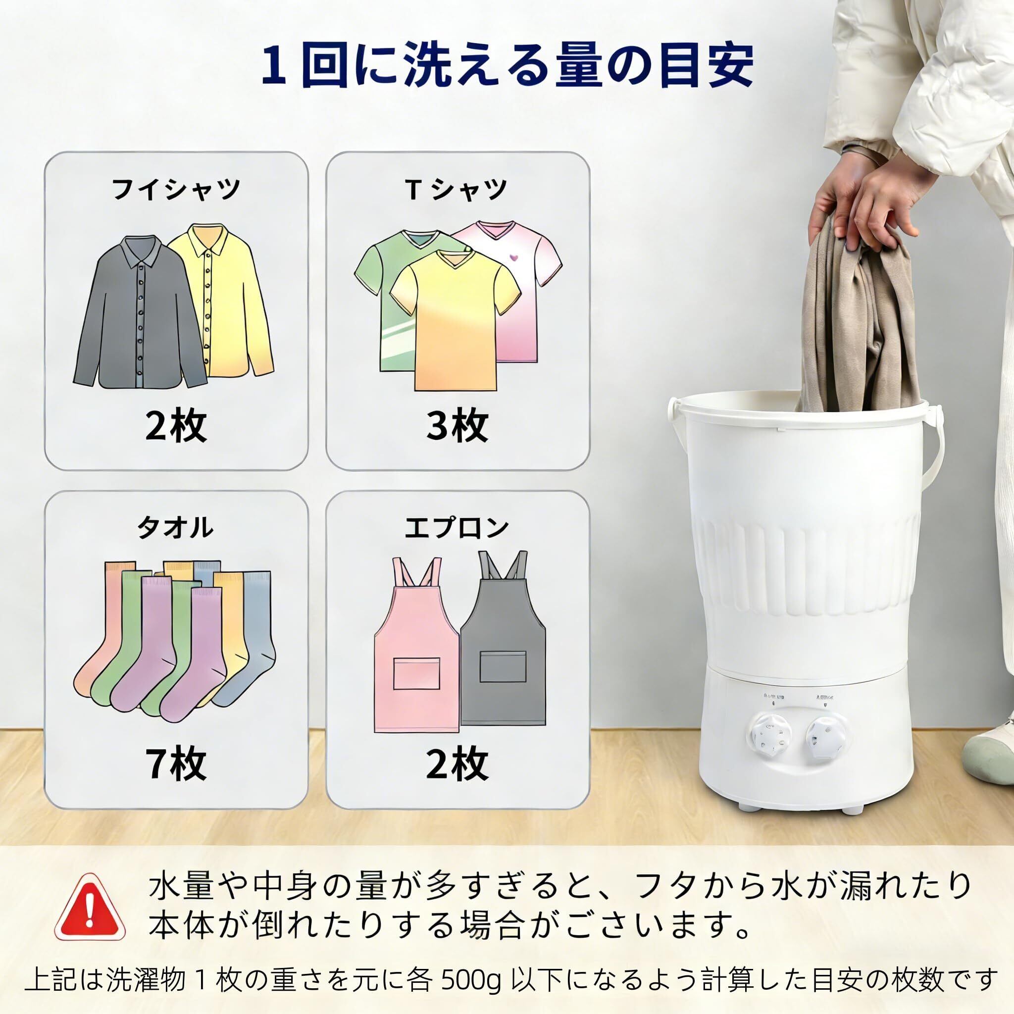 コンパクト軽量設計: サイズは約35.5×32.5×49.5cm(ハンドル除く)、重量わずか4.7kg。アパートや狭いスペースでも設置可能で、持ち運びや収納も簡単なポータブル洗濯機です。