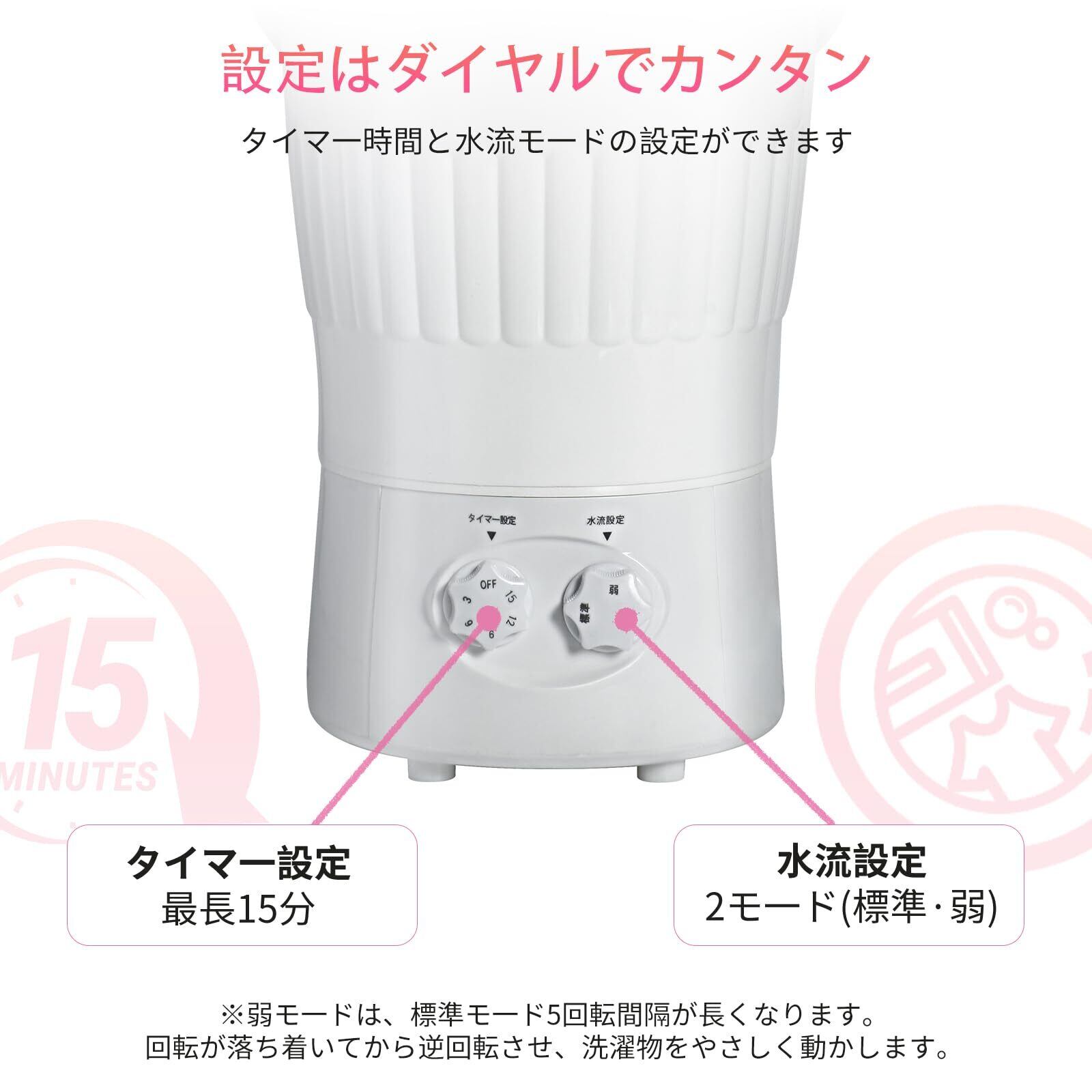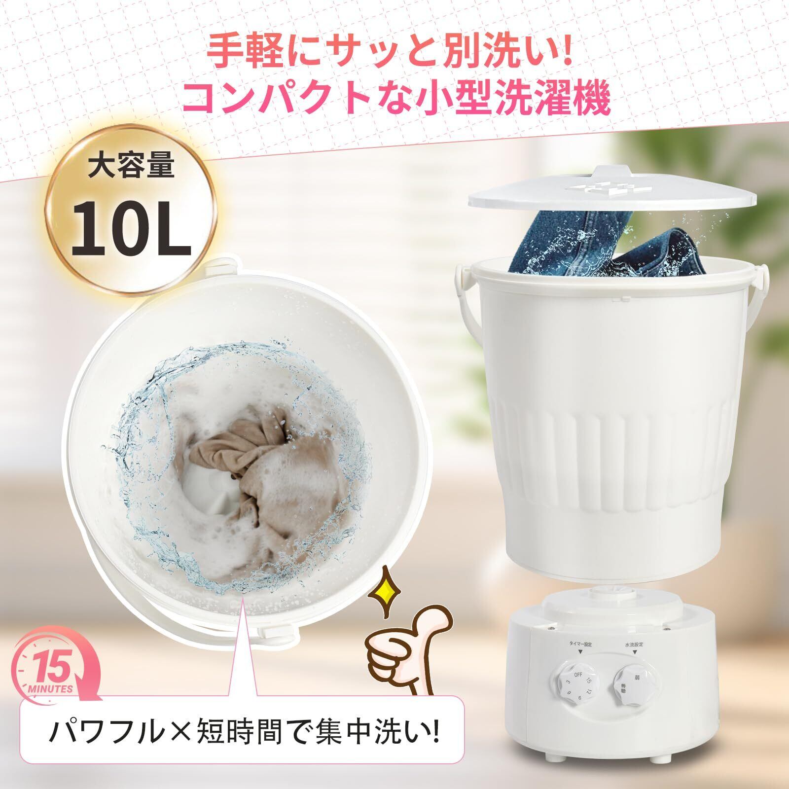 簡単操作:直感的に操作できるインターフェース。最大15分の洗濯時間と、洗浄力(弱・標準)の2種類から選べ、最大水量は10リットル。節水と省エネ設計で、環境にも経済的にも優れています。