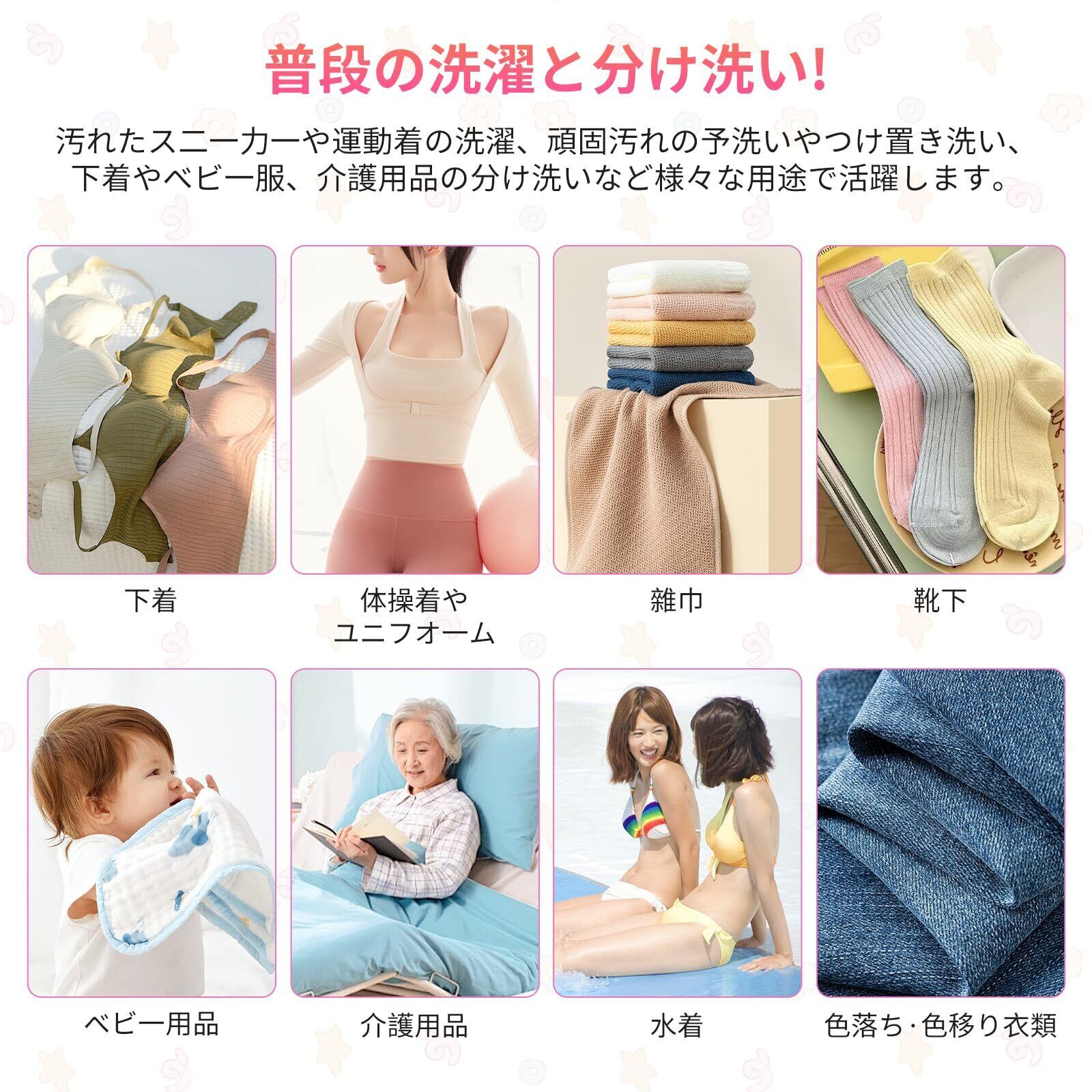 多用途洗浄:日常衣類や赤ちゃん用品(衣類、タオル、シーツなど)に最適な洗浄機能を提供します。キッチン雑巾や靴、泥汚れのついた野菜(ジャガイモ、ニンジンなど)も効果的に洗浄し、家庭の衛生を守ります。
