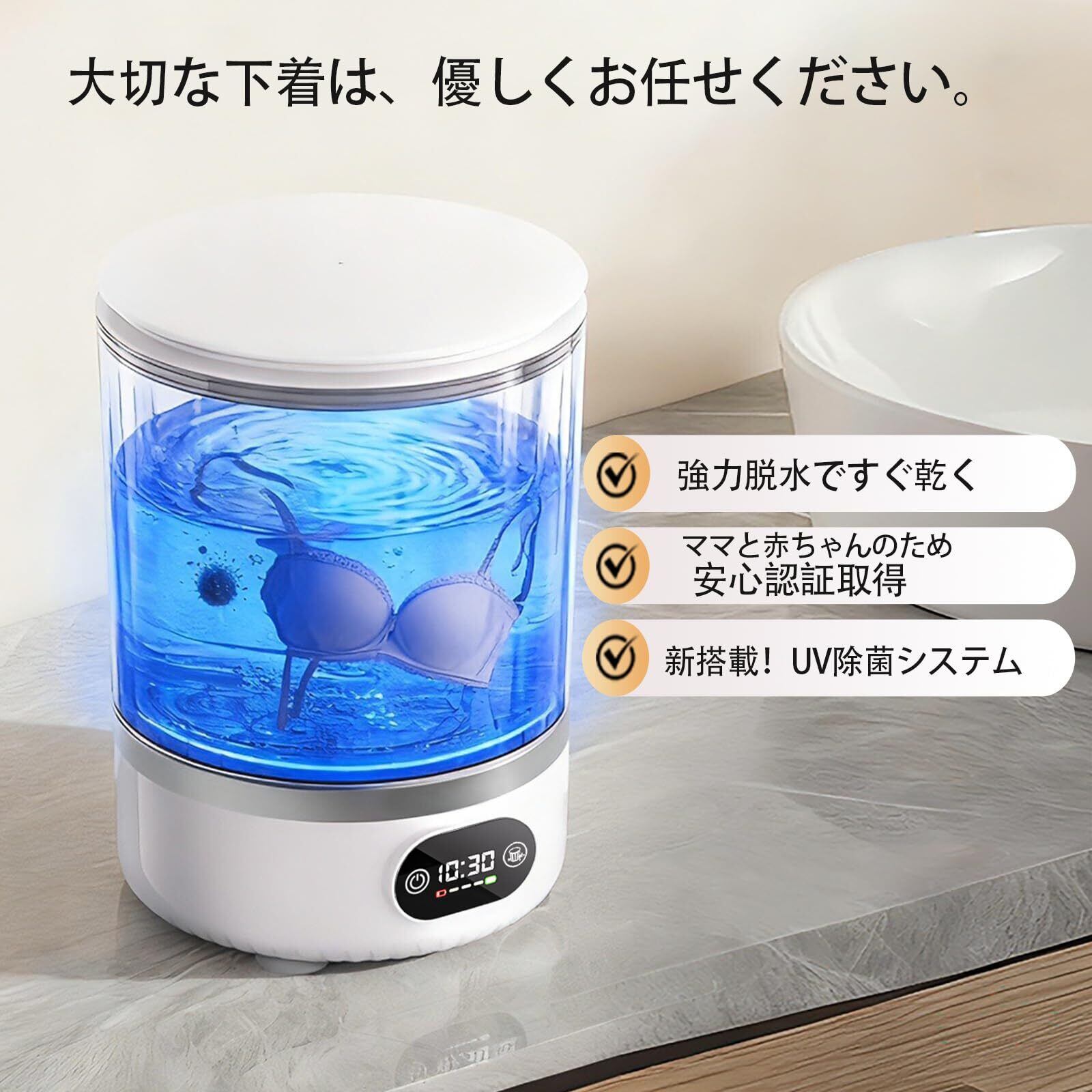 コンパクトな専用設計-肌着に特化した進化型ポータブル洗濯機。3リットルの容量で、下着・ベビー服・靴下を洗うのに最適な小型洗濯機です。かわいらしいデザインは寮やアパート、キャンピングカーなどにぴったり。日常的に着用する下着類のための、専用のお手入れソリューションを提供します。