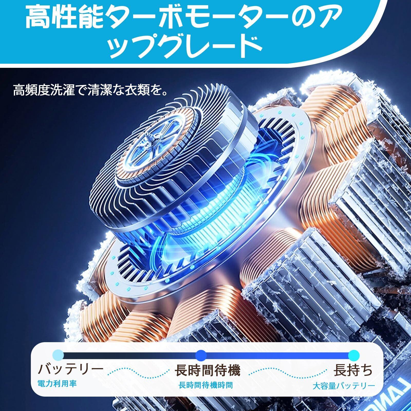高性能モーターと3,800mAhバッテリー搭載で、1回充電で最大20回の洗濯が可能。
