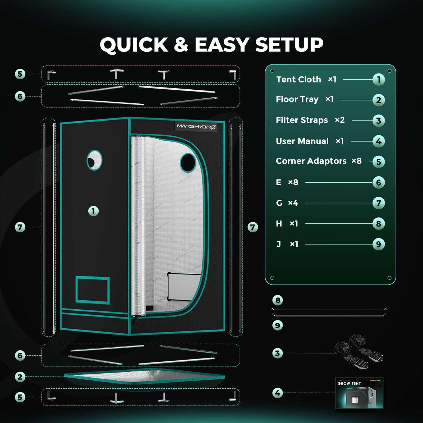 頑丈な金属構造と簡単な組み立て:安定した金属製のポール、コーナーアダプター、トップバーで構成されたこの成長テントは、耐久性に優れ、錆びたり塗装が剥がれたりしません。厚く頑丈な鋼製ポールは、他の小型成長テントよりも多くの重量に耐えることができます。ポップスナップと穴を使った簡単な組み立てで、水耕栽培やガーデニングの成長セットアップを数分で迅速に構築できます