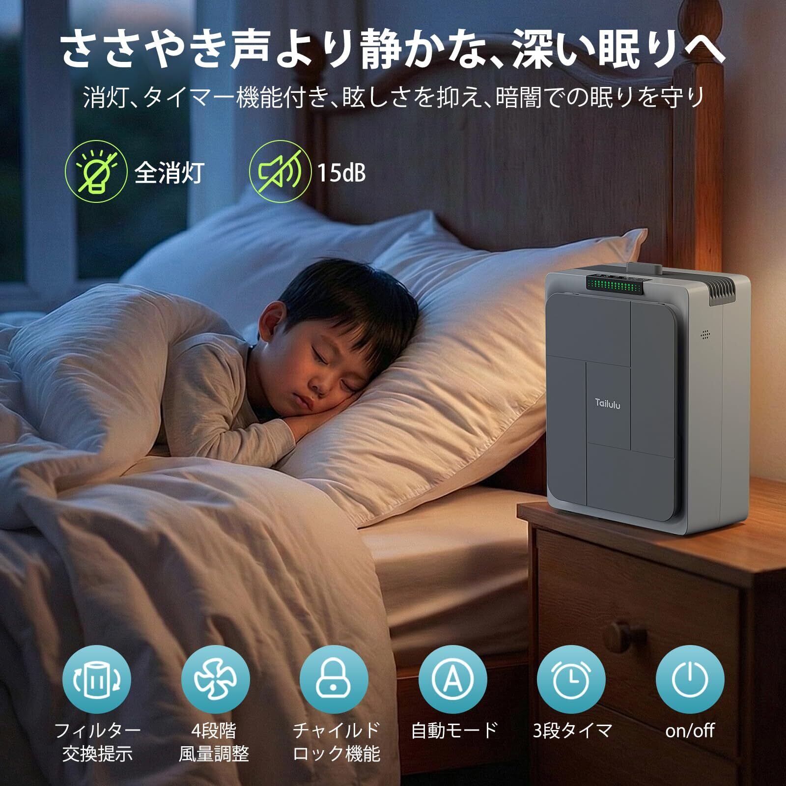 【超静音18dB・快眠を妨げない】 静音空気清浄機として、強力な浄化力を持ちながら、睡眠モードではわずか18dBの極静音運転を実現。表示灯を消灯できる機能も備えており、広い寝室でも眩しさや音を気にせず、朝までぐっすりと眠れる環境を整えます。