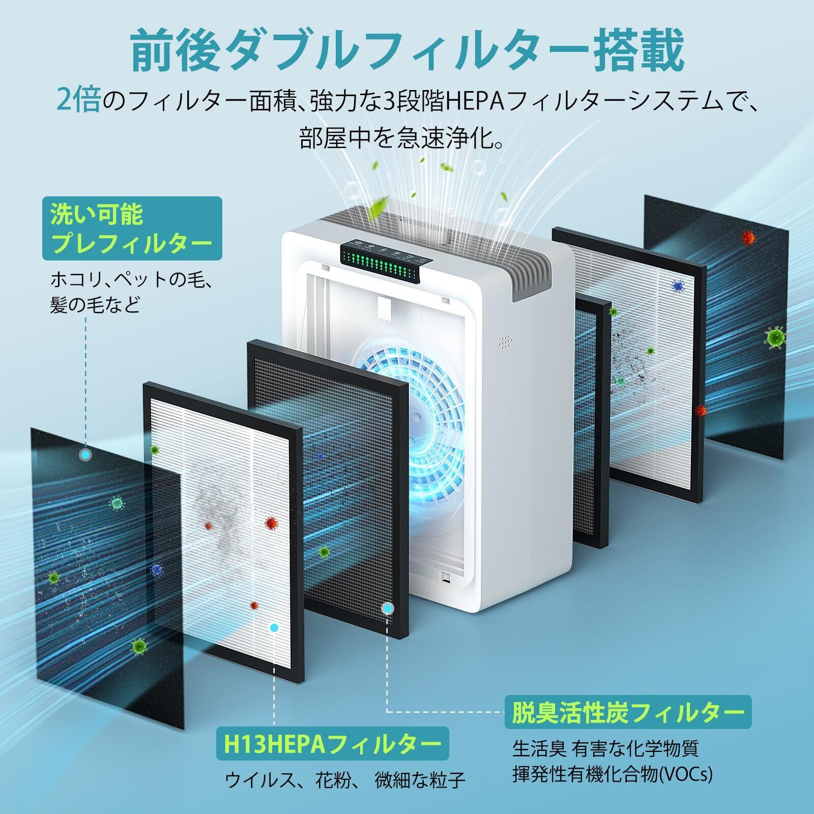 空気清浄機 24畳高精度ニオイセンサー 自動風量調整 空気質可視化 3段階ろ過 花粉対策 強力消臭 前後両面フィルター HEPA+活性炭 アロマ対応 集じん 静音 タイマー機能 チャイルドロック 省エネ 卓上 タバコ/カビ/ペット臭/PM2.5/除菌/ウイルス/アレルギー対策 PSE&METI認定(1.75Kg)