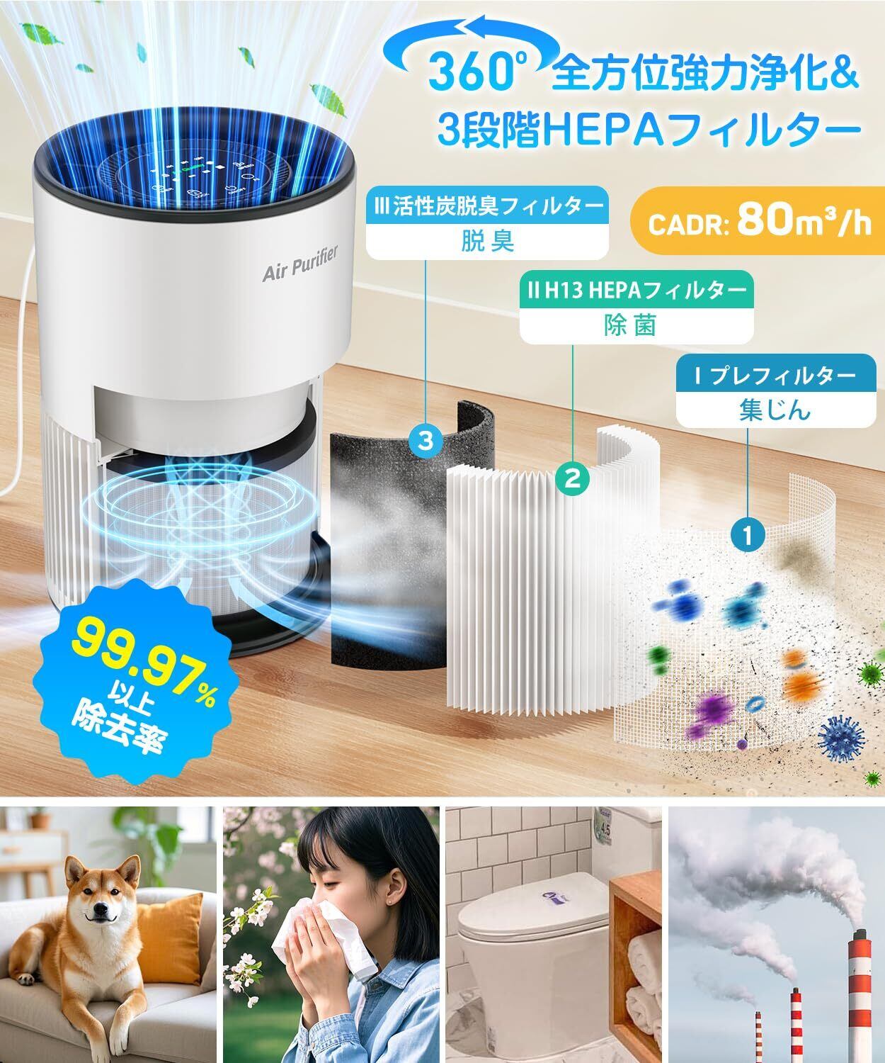桜シーズン/梅雨の限定版 空気清浄機 花粉先進のH13高効率フィルター技術を搭載し、浮遊花粉、カビの胞子、細菌などのアレルゲンを効率的に捕捉・除去し、アレルギー症状(くしゃみ、鼻水、鼻づまり、喉の痛み、皮膚のかゆみなど)を効果的に緩和し、睡眠の質を向上させ、呼吸の健康を守ります!1.3kgの超軽量ボディにUSB充電ケーブル付きで、15~20畳の広さに対応しています 。部屋から旅行キャラバンまでプロ級の保護が可能で、リビング/寝室/キッチン/玄関/子供部屋/オフィスが中安心になります。